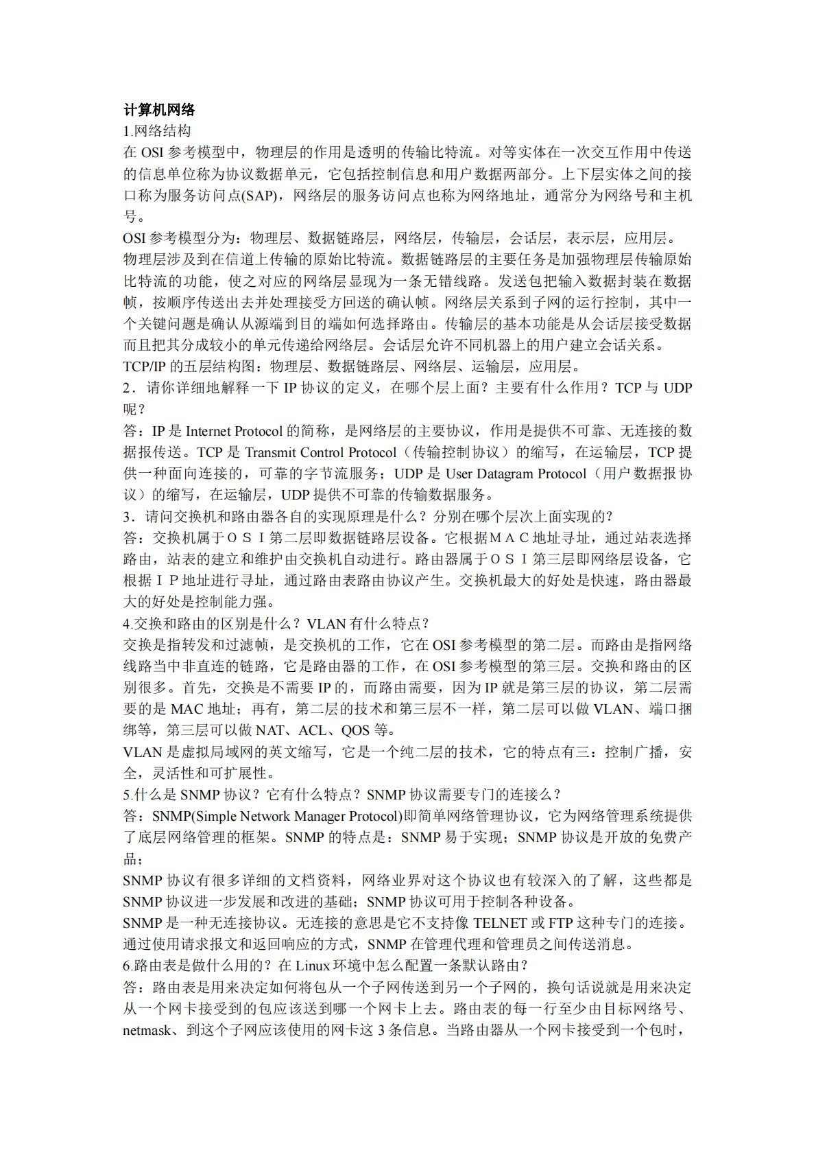 计算机网络1.网络结构在OSI参考模型中,物理层的作用是透明的传输比特流。对等实体在一次交互作用中传送的信息单位称为协议数据单元,它包括控制信息和用户数据两部分。上下层实体之间的接口称为服务访问点(SAP),网络层的服务访问点也称为网络地址,通常分为网络号和主机号。OSI参考模型分为:物理层、数据链路层,网络层,传输层,会话层,表示层,应用层。物理层涉及到在信道上传输的原始比特流。数据链路层的主要任务是加强物理层传输原始比特流的功能,使之对应的网络层显现为一条无错线路。发送包把输入数据封装在数据帧,按顺序传送出去并处理接受方回送的确认帧。网络层关系到子网的运行控制,其中一个关键问题是确认从源端...