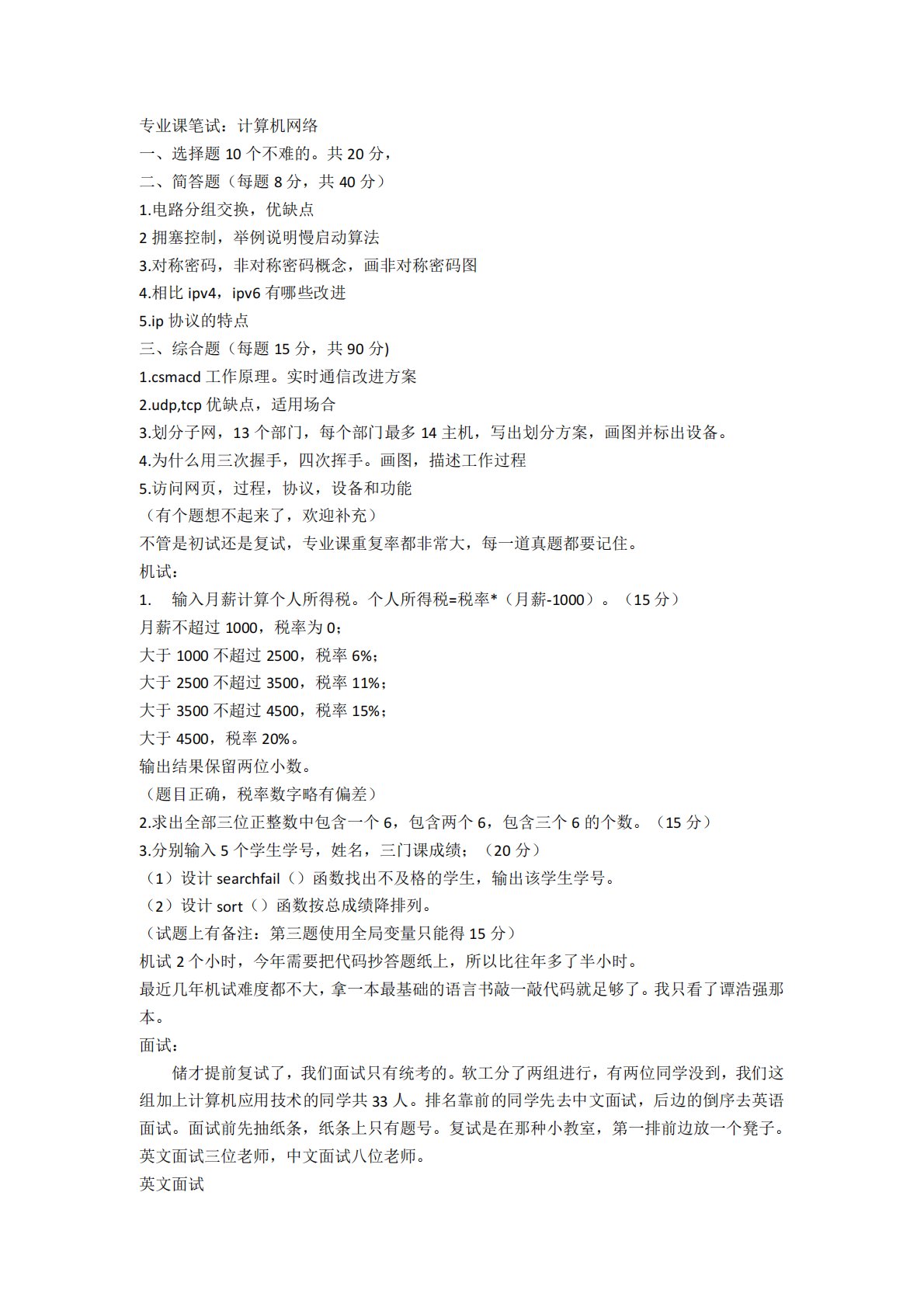 专业课笔试:计算机网络一、选择题10个不难的。共20分,二、简答题(每题8分,共40分)1.电路分组交换,优缺点2拥塞控制,举例说明慢启动算法3.对称密码,非对称密码概念,画非对称密码图4.相比ipv4,ipv6有哪些改进5.ip协议的特点三、综合题(每题15分,共90分)1.csmacd工作原理。实时通信改进方案2.udp,tcp优缺点,适用场合3.划分子网,13个部门,每个部门最多14主机,写出划分方案,画图并标出设备。4.为什么用三次握手,四次挥手。画图,描述工作过程5.访问网页,过程,协议,设备和功能(有个题想不起来了,欢迎补充)不管是初试还是复试,专业课重复率都非常大,每一道真题都要...