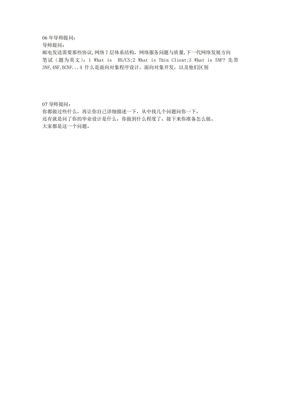 06年导师提问:导师提问:邮电发送需要那些协议,网络7层体系结构,网络服务问题与质量,下一代网络发展方向笔试(题为英文):1WhatisBS/CS;2WhatisThinClient;3Whatis5NF?先答3NF,4NF,BCNF...4什么是面向对象程序设计,面向对象开发,以及他们区别07导师提问:你都做过些什么,再让你自己详细描述一下,从中找几个问题问你一下,还有就是问了你的毕业设计是什么,你做到什么程度了,接下来你准备怎么做。大家都是这一个问题。06年导师提问:导师提问:邮电发送需要那些协议,网络7层体系结构,网络服务问题与质量,下一代网络发展方向笔试(题为英文):1WhatisBS...