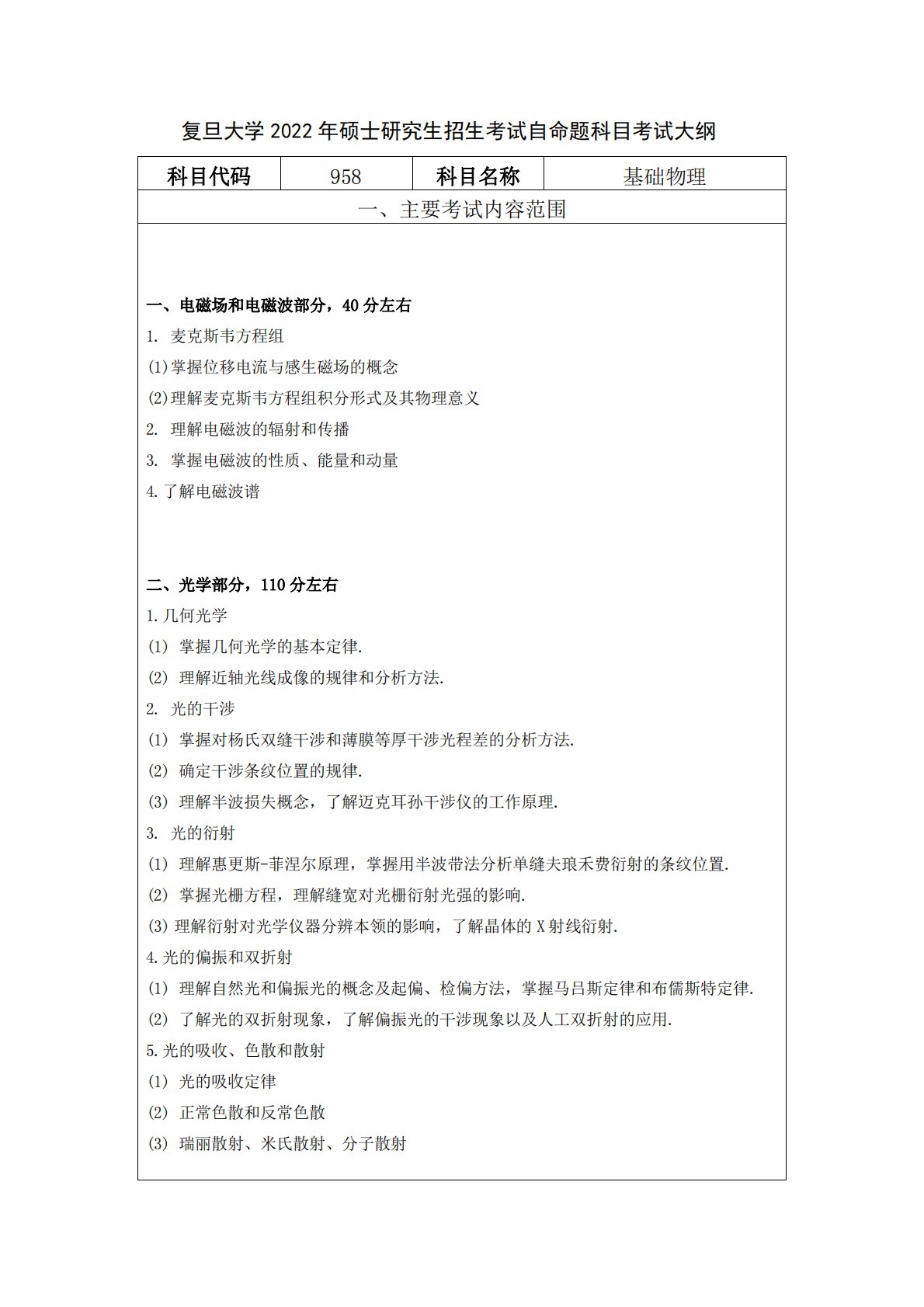 复旦大学2022年硕士研究生招生考试自命题科目考试大纲科目代码958科目名称基础物理一、主要考试内容范围一、电磁场和电磁波部分,40分左右1.麦克斯韦方程组(1)掌握位移电流与感生磁场的概念(2)理解麦克斯韦方程组积分形式及其物理意义2.理解电磁波的辐射和传播3.掌握电磁波的性质、能量和动量4.了解电磁波谱二、光学部分,110分左右1.几何光学(1)掌握几何光学的基本定律.(2)理解近轴光线成像的规律和分析方法.2.光的干涉(1)掌握对杨氏双缝干涉和薄膜等厚干涉光程差的分析方法.(2)确定干涉条纹位置的规律.(3)理解半波损失概念,了解迈克耳孙干涉仪的工作原理.3.光的衍射(1)理解惠更斯-菲...