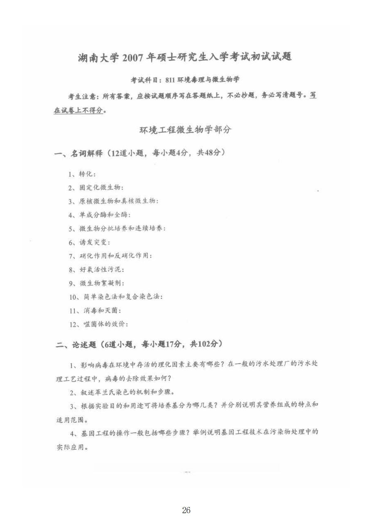 湖南大学811环境毒理与环境工程微生物综合2007年真题