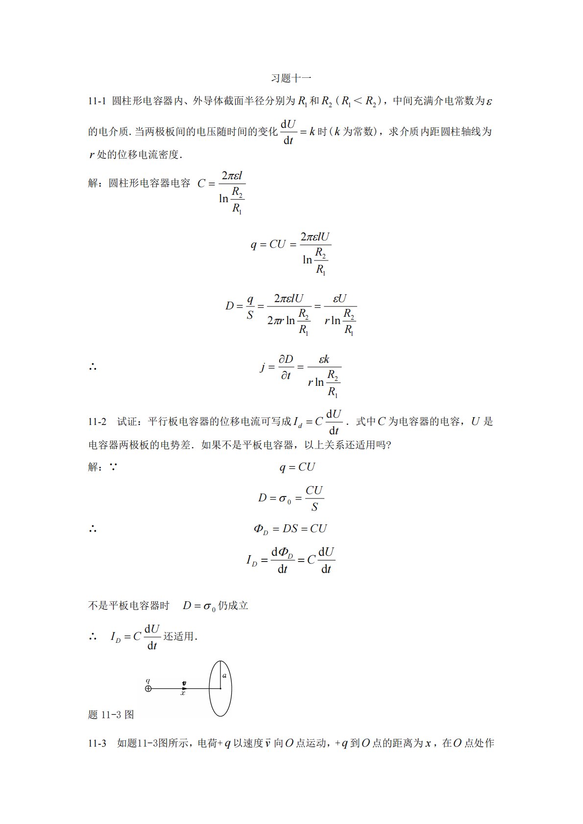 习题十一11-1圆柱形电容器内、外导体截面半径分别为1R和2R(1R<2R),中间充满介电常数为的电介质.当两极板间的电压随时间的变化ktUdd时(k为常数),求介质内距圆柱轴线为r处的位移电流密度.解:圆柱形电容器电容12ln2RRlC12ln2RRlUCUq1212lnln22RRrURRrlUSqD∴12lnRRrktDj11-2试证:平行板电容器的位移电流可写成tUCIddd.式中C为电容器的电容,U是电容器两极板的电势差.如果不是平板电容器,以上关系还适用吗?解:∵CUqSCUD0∴CUDSD不是平板电容器时0D仍成立∴t...