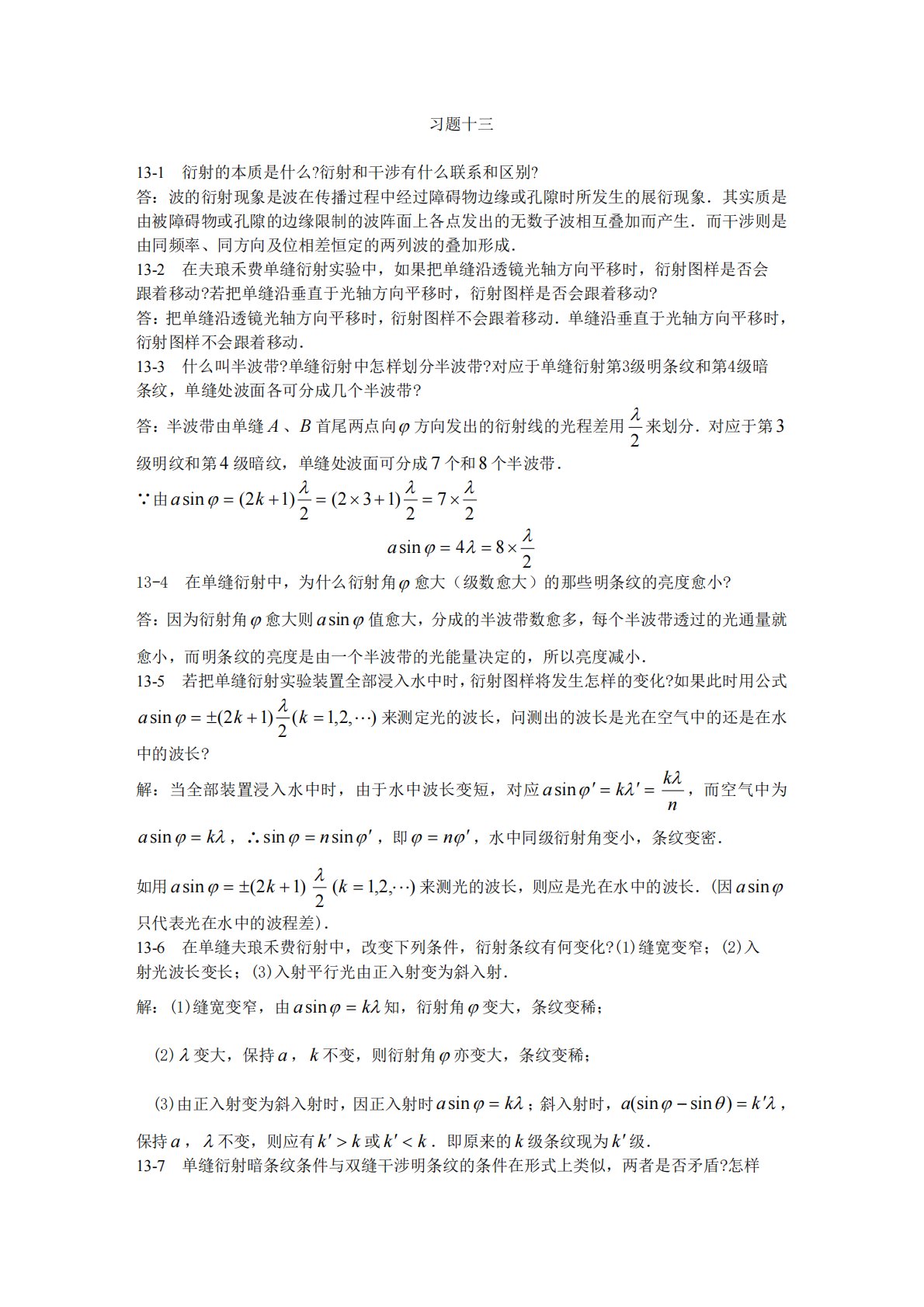 习题十三13-1衍射的本质是什么?衍射和干涉有什么联系和区别?答:波的衍射现象是波在传播过程中经过障碍物边缘或孔隙时所发生的展衍现象.其实质是由被障碍物或孔隙的边缘限制的波阵面上各点发出的无数子波相互叠加而产生.而干涉则是由同频率、同方向及位相差恒定的两列波的叠加形成.13-2在夫琅禾费单缝衍射实验中,如果把单缝沿透镜光轴方向平移时,衍射图样是否会跟着移动?若把单缝沿垂直于光轴方向平移时,衍射图样是否会跟着移动?答:把单缝沿透镜光轴方向平移时,衍射图样不会跟着移动.单缝沿垂直于光轴方向平移时,衍射图样不会跟着移动.13-3什么叫半波带?单缝衍射中怎样划分半波带?对应于单缝衍射第3级明条纹和第4...
