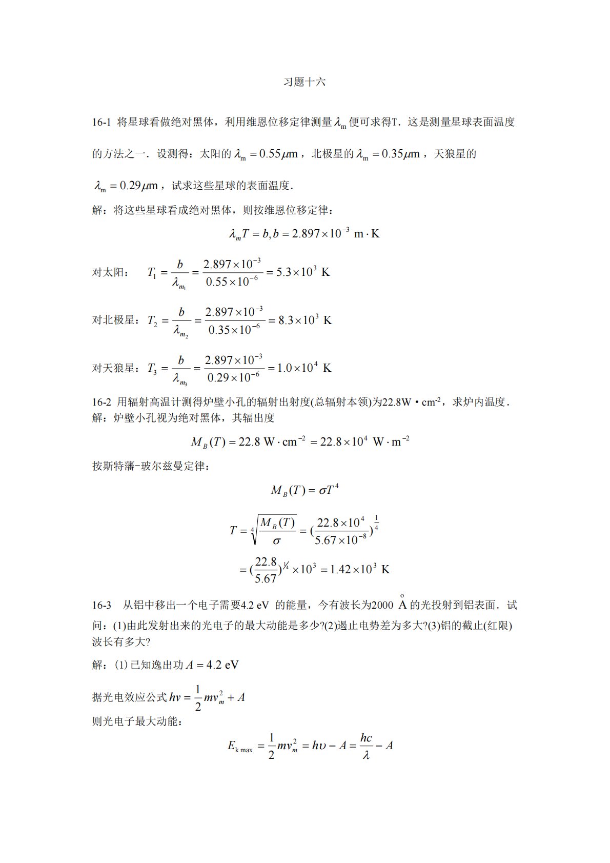 习题十六16-1将星球看做绝对黑体,利用维恩位移定律测量m便可求得T.这是测量星球表面温度的方法之一.设测得:太阳的m55.0m,北极星的m35.0m,天狼星的m29.0m,试求这些星球的表面温度.解:将这些星球看成绝对黑体,则按维恩位移定律:Km10897.2,3bbTm对太阳:K103.51055.010897.236311mbT对北极星:K103.81035.010897.236322mbT对天狼星:K100.11029.010897.246333mbT16-2用辐射高温计测得炉壁小孔的辐射出射度(总辐...