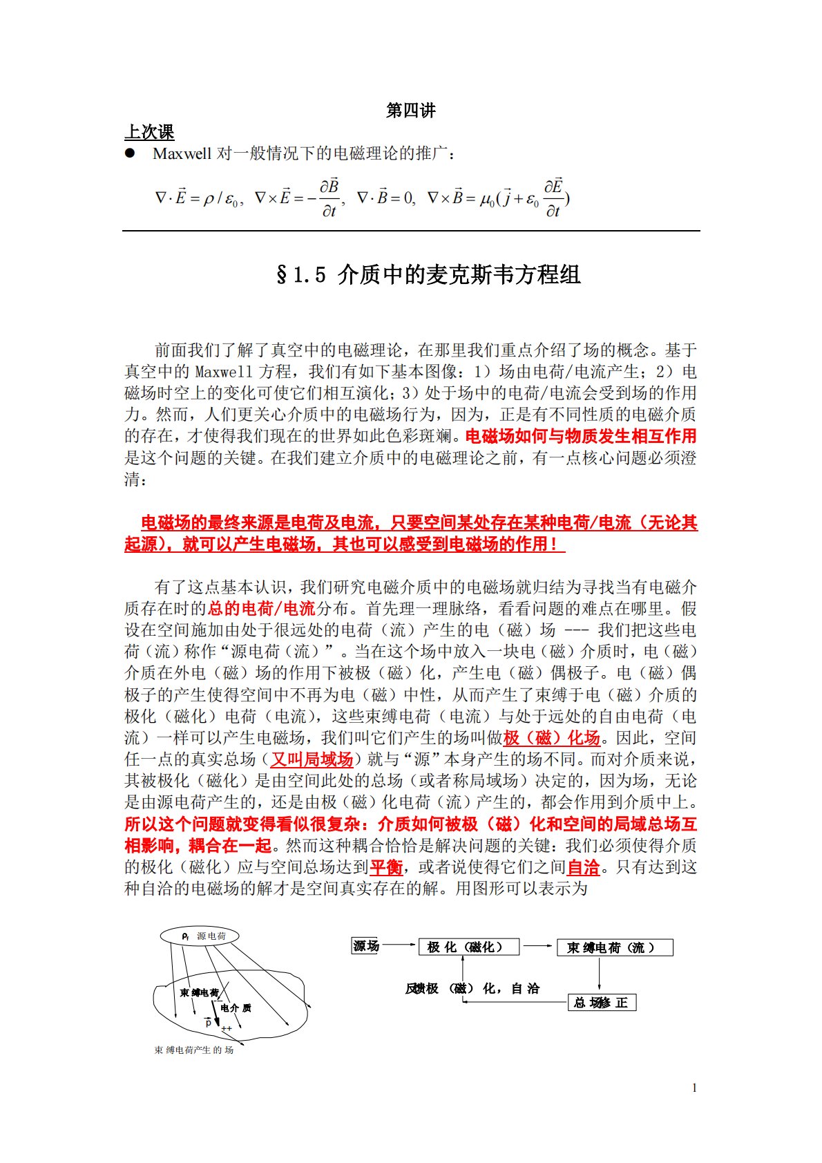 1第四讲上次课Maxwell对一般情况下的电磁理论的推广:000/,,0,()BEEEBBjtt§1.5介质中的麦克斯韦方程组前面我们了解了真空中的电磁理论,在那里我们重点介绍了场的概念。基于真空中的Maxwell方程,我们有如下基本图像:1)场由电荷/电流产生;2)电磁场时空上的变化可使它们相互演化;3)处于场中的电荷/电流会受到场的作用力。然而,人们更关心介质中的电磁场行为,因为,正是有不同性质的电磁介质的存在,才使得我们现在的世界如此色彩斑斓。电磁场如何与物质发生相互作用是这个问题的关键。在我们建立介质中的电磁理论之前,有一点核...