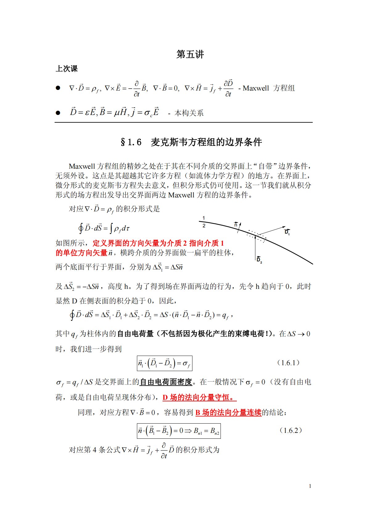 1第五讲上次课,,0,ffDDEBBHjtt-Maxwell方程组,,cDEBHjE-本构关系§1.6麦克斯韦方程组的边界条件Maxwell方程组的精妙之处在于其在不同介质的交界面上“自带”边界条件,无须外设。这点是其超越其它许多方程(如流体力学方程)的地方。在界面上,微分形式的麦克斯韦方程失去意义,但积分形式仍可使用。这一节我们就从积分形式的场方程出发导出交界面两边Maxwell方程的边界条件。对应fD的积分形式是fDdSd如图所示,定义界面的方向矢量为介质2指向介质1的单位方向矢量n...