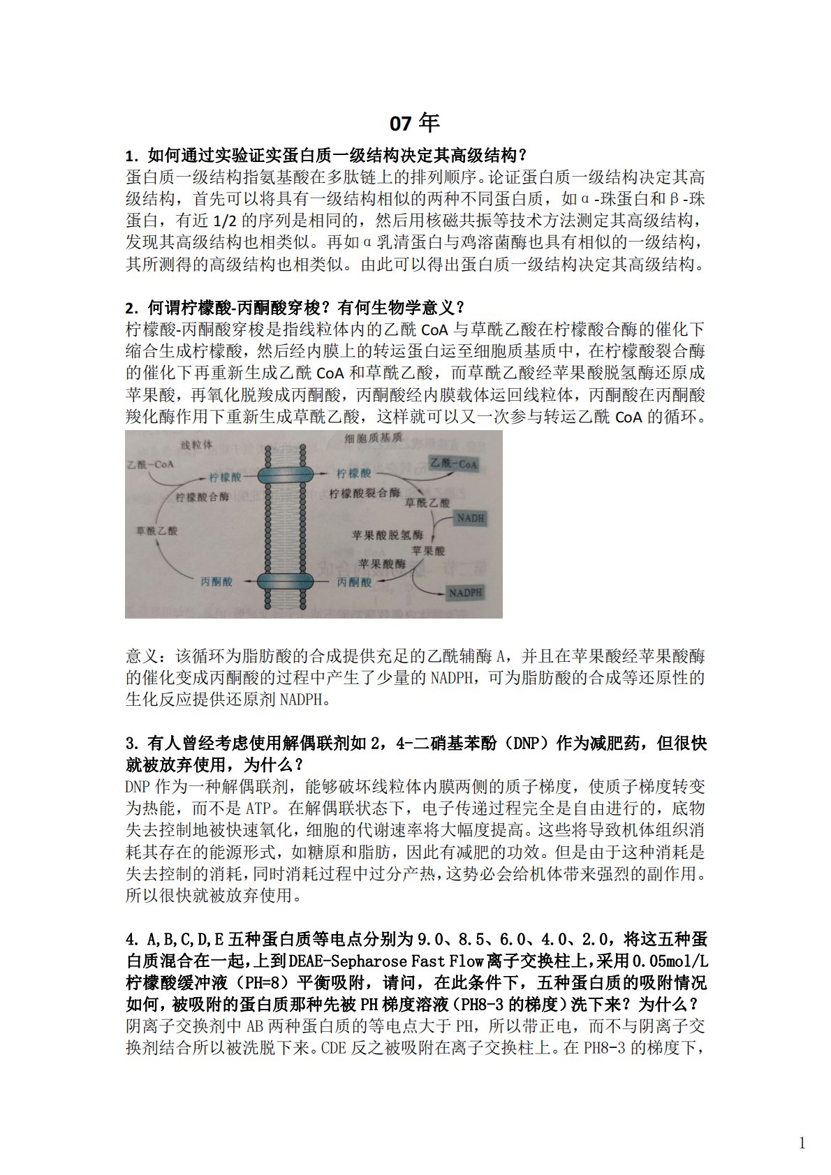 07年1.如何通过实验证实蛋白质一级结构决定其高级结构?蛋白质一级结构指氨基酸在多肽链上的排列顺序。论证蛋白质一级结构决定其高级结构,首先可以将具有一级结构相似的两种不同蛋白质,如α-珠蛋白和β-珠蛋白,有近1/2的序列是相同的,然后用核磁共振等技术方法测定其高级结构,发现其高级结构也相类似。再如α乳清蛋白与鸡溶菌酶也具有相似的一级结构,其所测得的高级结构也相类似。由此可以得出蛋白质一级结构决定其高级结构。2.何谓柠檬酸-丙酮酸穿梭?有何生物学意义?柠檬酸-丙酮酸穿梭是指线粒体内的乙酰CoA与草酰乙酸在柠檬酸合酶的催化下缩合生成柠檬酸,然后经内膜上的转运蛋白运至细胞质基质中,在柠檬酸裂合酶的催...