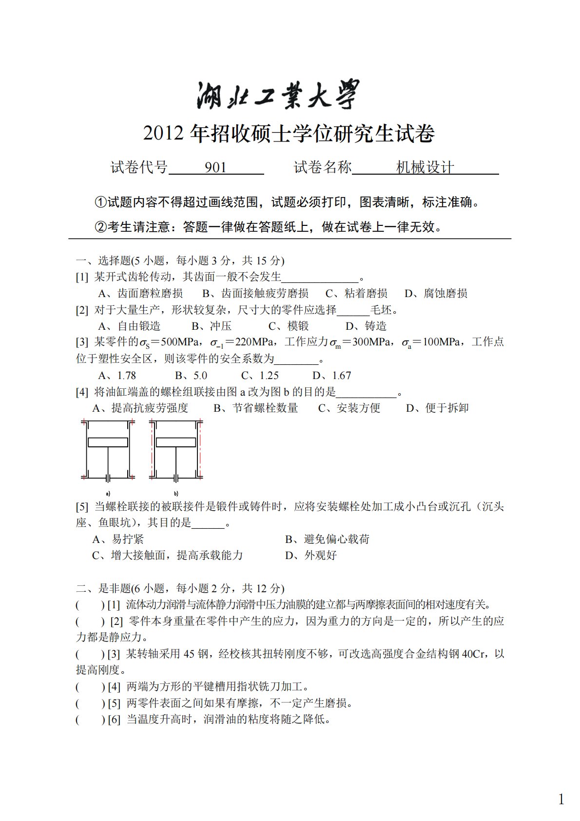 2012年招收硕士学位研究生试卷试卷代号901试卷名称机械设计①试题内容不得超过画线范围,试题必须打印,图表清晰,标注准确。②考生请注意:答题一律做在答题纸上,做在试卷上一律无效。一、选择题(5小题,每小题3分,共15分)[1]某开式齿轮传动,其齿面一般不会发生______________。A、齿面磨粒磨损B、齿面接触疲劳磨损C、粘着磨损D、腐蚀磨损[2]对于大量生产,形状较复杂,尺寸大的零件应选择______毛坯。A、自由锻造B、冲压C、模锻D、铸造[3]某零件的S=500MPa,−1=220MPa,工作应力m=300MPa,a=100MPa,工作点位于塑性安全区,则该零件的安全系数...