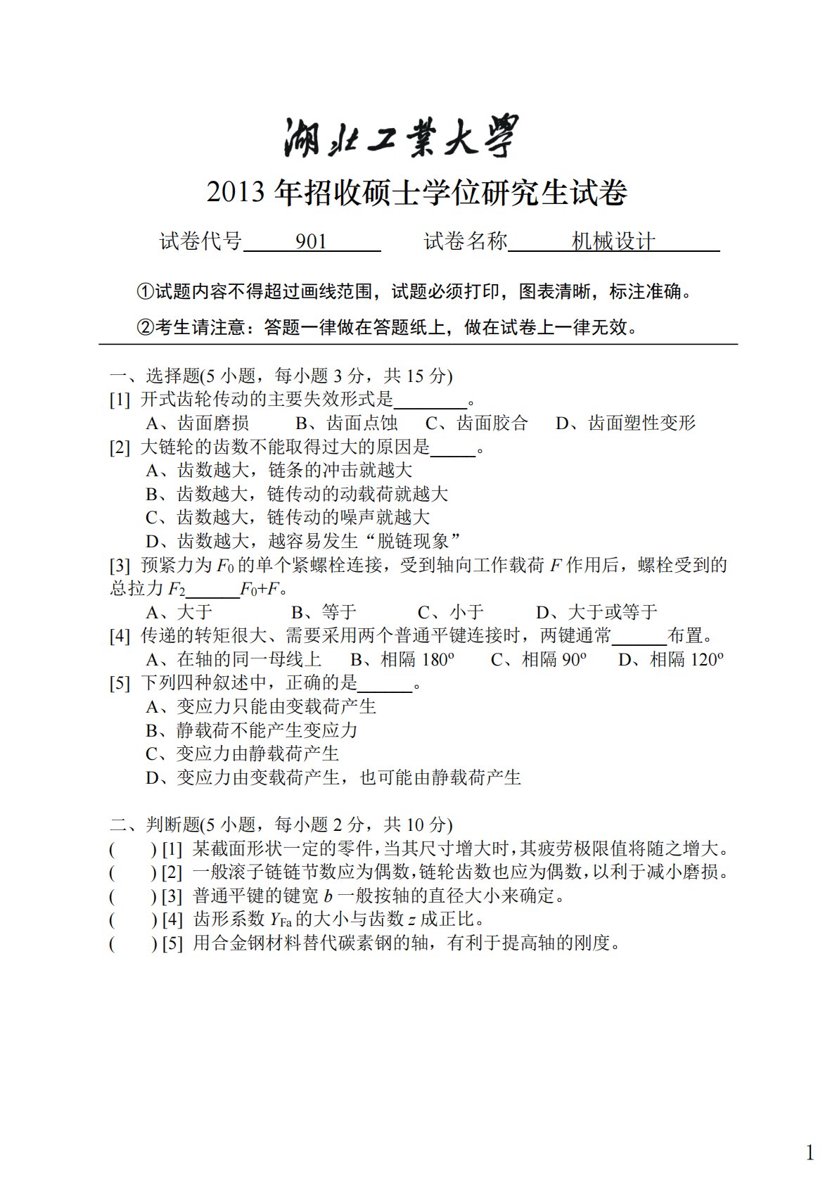 2013年招收硕士学位研究生试卷试卷代号901试卷名称机械设计①试题内容不得超过画线范围,试题必须打印,图表清晰,标注准确。②考生请注意:答题一律做在答题纸上,做在试卷上一律无效。一、选择题(5小题,每小题3分,共15分)[1]开式齿轮传动的主要失效形式是________。A、齿面磨损B、齿面点蚀C、齿面胶合D、齿面塑性变形[2]大链轮的齿数不能取得过大的原因是_____。A、齿数越大,链条的冲击就越大B、齿数越大,链传动的动载荷就越大C、齿数越大,链传动的噪声就越大D、齿数越大,越容易发生“脱链现象”[3]预紧力为F0的单个紧螺栓连接,受到轴向工作载荷F作用后,螺栓受到的总拉力F2_____...