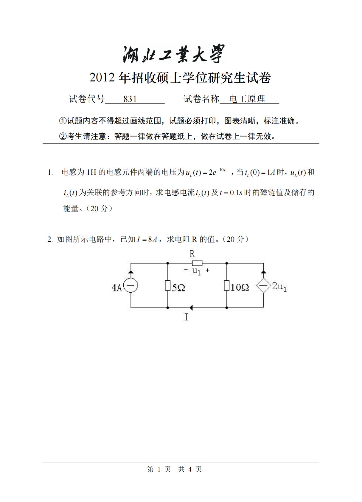 2012年招收硕士学位研究生试卷试卷代号831试卷名称电工原理①试题内容不得超过画线范围,试题必须打印,图表清晰,标注准确。②考生请注意:答题一律做在答题纸上,做在试卷上一律无效。第1页共4页1.电感为1H的电感元件两端的电压为10()2tLute,当(0)1LiA时,()Lut和()Lit为关联的参考方向时,求电感电流()Lit及0.1ts时的磁链值及储存的能量。(20分)2.如图所示电路中,已知8IA,求电阻R的值。(20分)湖北工业大学2012年招收硕士学位研究生试卷第2页共4页3.如图所示电路为含有理想运算放大器的电路,图中方框为理想运放。求:(1)输出电压0u与输入电压1u...