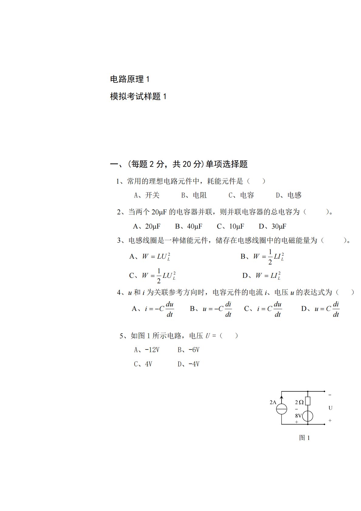 电路原理1模拟考试样题1一、(每题2分,共20分)单项选择题1、常用的理想电路元件中,耗能元件是()A、开关B、电阻C、电容D、电感2、当两个20μF的电容器并联,则并联电容器的总电容为()。A、20μFB、40μFC、10μFD、30μF3、电感线圈是一种储能元件,储存在电感线圈中的电磁能量为()。A、2LLUWB、221LLIWC、221LLUWD、2LLIW4、u和i为关联参考方向时,电容元件的电流i、电压u的表达式为()A、dtduCiB、dtdiCuC、dtduCiD、dtdiCu5、如图1所示电路,电压U=()A、-12VB、-6VC、4VD、-4V图1湖南工业...