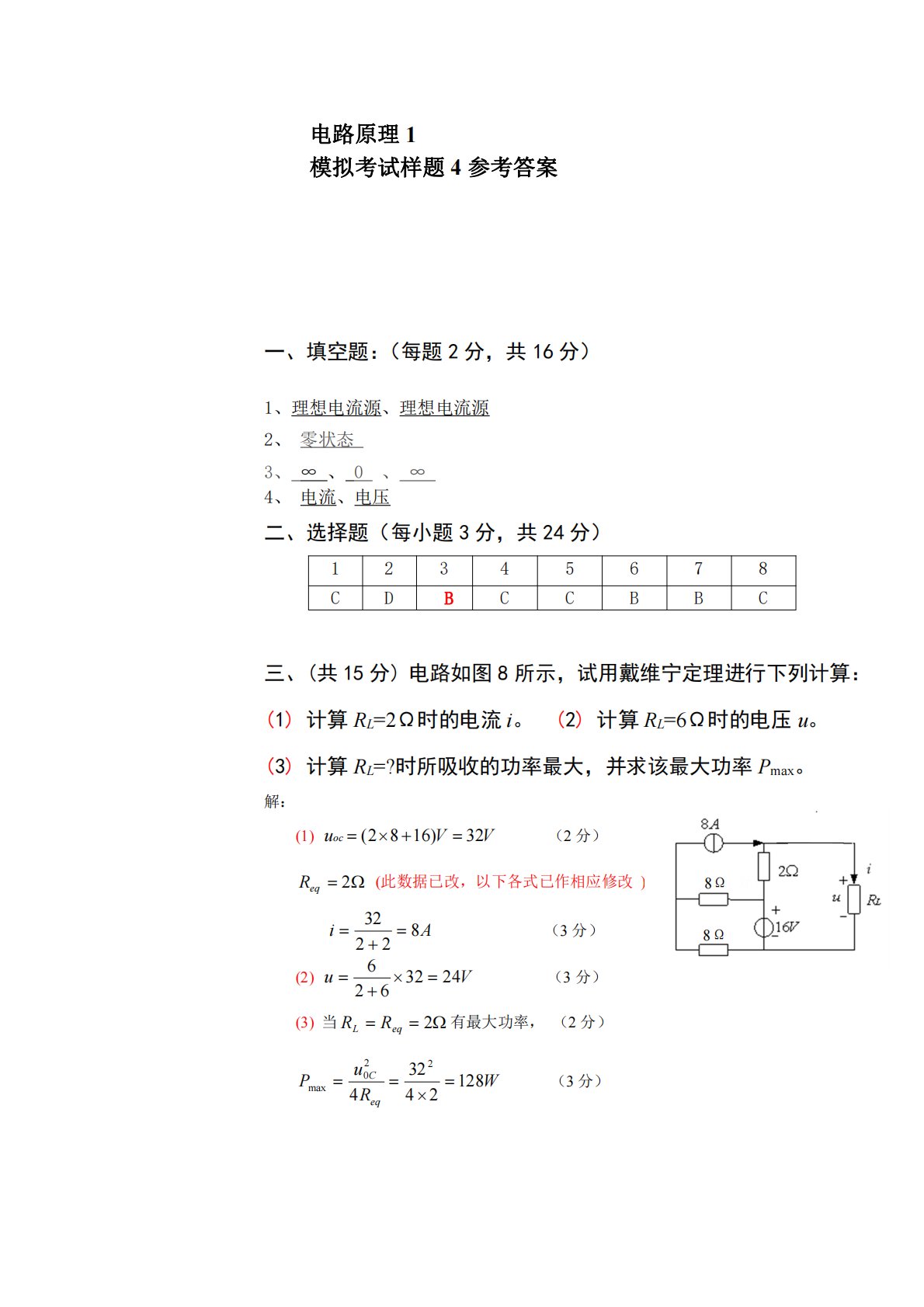 电路原理1模拟考试样题4参考答案一、填空题:(每题2分,共16分)1、理想电流源、理想电流源2、零状态3、∞、0、∞4、电流、电压二、选择题(每小题3分,共24分)三、(共15分)电路如图8所示,试用戴维宁定理进行下列计算:(1)计算RL=2Ω时的电流i。(2)计算RL=6Ω时的电压u。(3)计算RL=?时所吸收的功率最大,并求该最大功率Pmax。解:(1)(2816)32ocuVV(2分)2eqR(此数据已改,以下各式已作相应修改)(2分)Ai82232(3分)(2)Vu2432626(3分)(3)当2eqLRR有最大功率,(2分)WRuPeqC1282432...