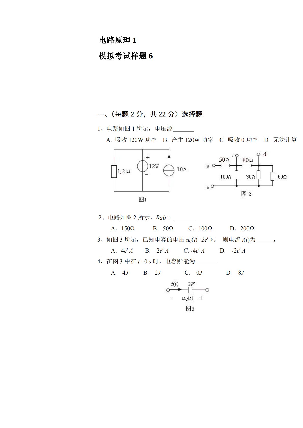 电路原理1模拟考试样题6一、(每题2分,共22分)选择题1、电路如图1所示,电压源A.吸收120W功率B.产生120W功率C.吸收0功率D.无法计算2、电路如图2所示,Rab=A.150ΩB.50ΩC.100ΩD.200Ω3、如图3所示,已知电容的电压uC(t)=2etV,则电流i(t)为,A.4etAB.2etAC.-4etAD.-2etA4、在图3中在t=0s时,电容贮能为A.4JB.2JC.0JD.8J湖南工业大学考试试卷纸系(院)课程名称班级姓名学号密封线5、已知图4中电流表A1、A2、A3读数均为10A,则电流Is为A.10AB.20AC.30AD.40A6、任意一个相量乘以j相当于...