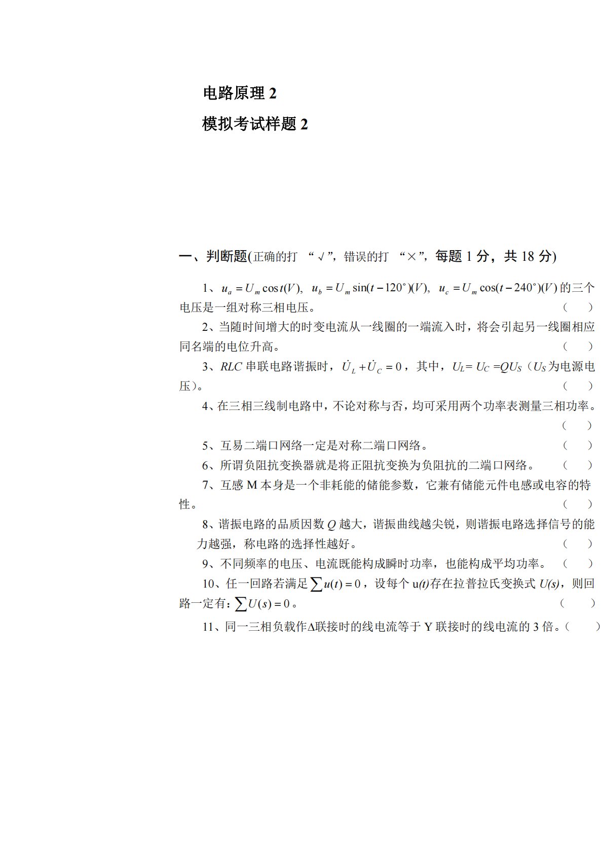电路原理2模拟考试样题2一、判断题(正确的打“√”,错误的打“×”,每题1分,共18分)1、),(cosVtUuma),)(120sin(VtUumb))(240cos(VtUumc的三个电压是一组对称三相电压。()2、当随时间增大的时变电流从一线圈的一端流入时,将会引起另一线圈相应同名端的电位升高。()3、RLC串联电路谐振时,0CLUU,其中,UL=UC=QUS(US为电源电压)。()4、在三相三线制电路中,不论对称与否,均可采用两个功率表测量三相功率。()5、互易二端口网络一定是对称二端口网络。()6、所谓负阻抗变换器就是将正阻抗变换为负阻抗的二端口网络。()7、互...