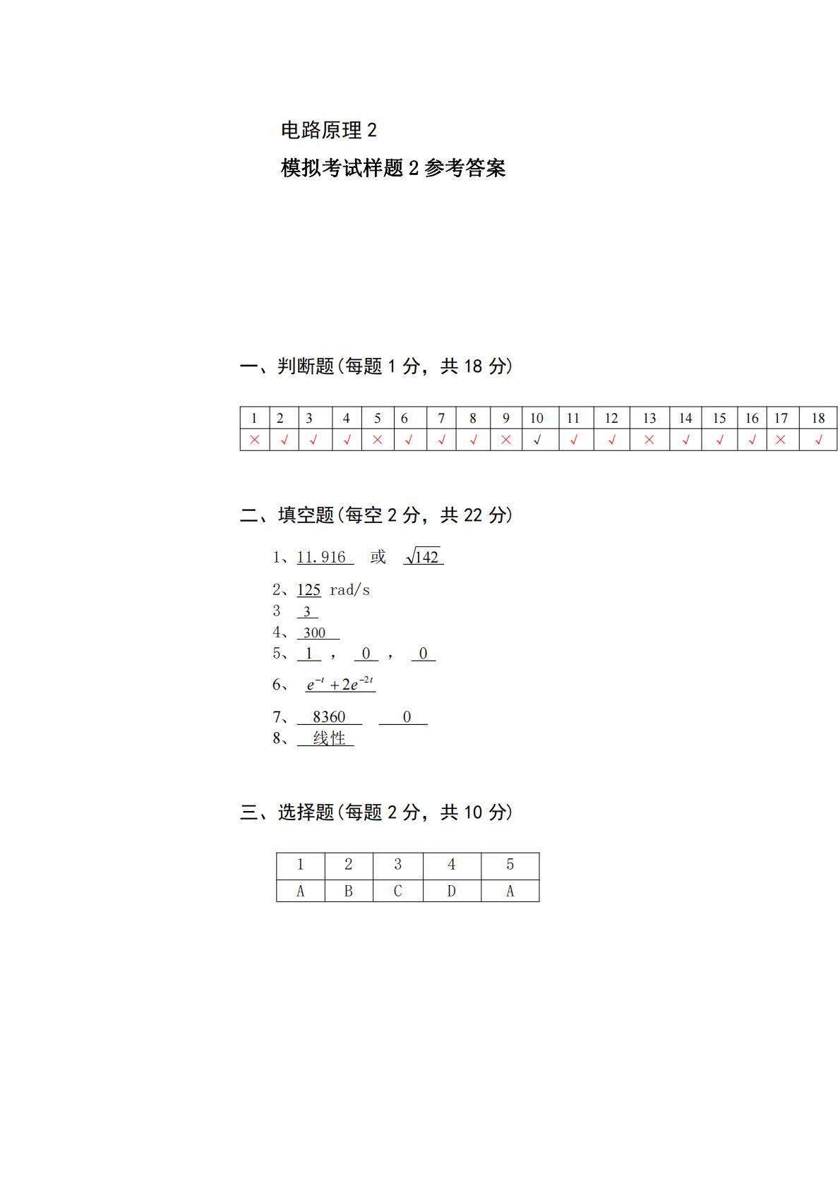 电路原理2模拟考试样题2参考答案一、判断题(每题1分,共18分)123456789101112131415161718×√√√×√√√×√√√×√√√×√二、填空题(每空2分,共22分)1、11.916或1422、125rad/s334、3005、1,0,06、ttee227、836008、线性三、选择题(每题2分,共10分)12345ABCDA四、(共10分)如图5所示电路中,若要使0i,问电源的角频率ω是多少?解:(1)由题图判断线圈的同名端,得电路如图5.1所示:(2分)(2)画去耦等效电路如图5.2所示:(3分)(3)(3分)得(2分)(评分说明:该题若未画图5.1,只要计算正...