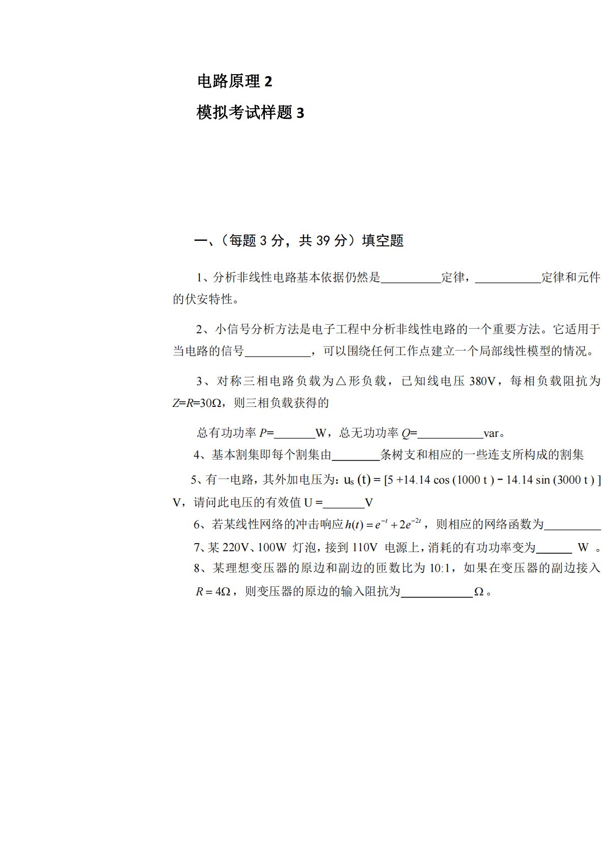 电路原理2模拟考试样题3一、(每题3分,共39分)填空题1、分析非线性电路基本依据仍然是定律,定律和元件的伏安特性。2、小信号分析方法是电子工程中分析非线性电路的一个重要方法。它适用于当电路的信号,可以围绕任何工作点建立一个局部线性模型的情况。3、对称三相电路负载为△形负载,已知线电压380V,每相负载阻抗为Z=R=30,则三相负载获得的总有功功率P=W,总无功功率Q=var。4、基本割集即每个割集由条树支和相应的一些连支所构成的割集5、有一电路,其外加电压为:us(t)=[5+14.14cos(1000t)–14.14sin(3000t)]V,请问此电压的有效值U=V6、若某线性网络的冲击...