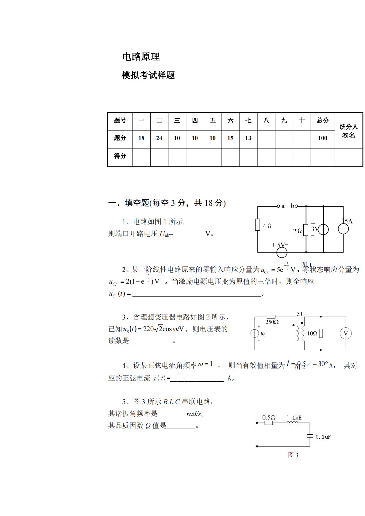 电路原理模拟考试样题题号一二三四五六七八九十总分统分人签名题分18241010101513100得分一、填空题(每空3分,共18分)1、电路如图1所示,则端口开路电压Uab=V。2、某一阶线性电路原来的零输入响应分量为Ve53tCxu,零状态响应分量为V)e1(23tCfu。当激励电源电压变为原值的三倍时,则全响应)(tuC。3、含理想变压器电路如图2所示,已知Vcos2220Sttu,则电压表的读数是。4、设某正弦电流角频率1,则当有效值相量为305.0IA,其对应的正弦电流i(t)=_______________A。5、图3所示R,L,C串联电路,其谐振角...