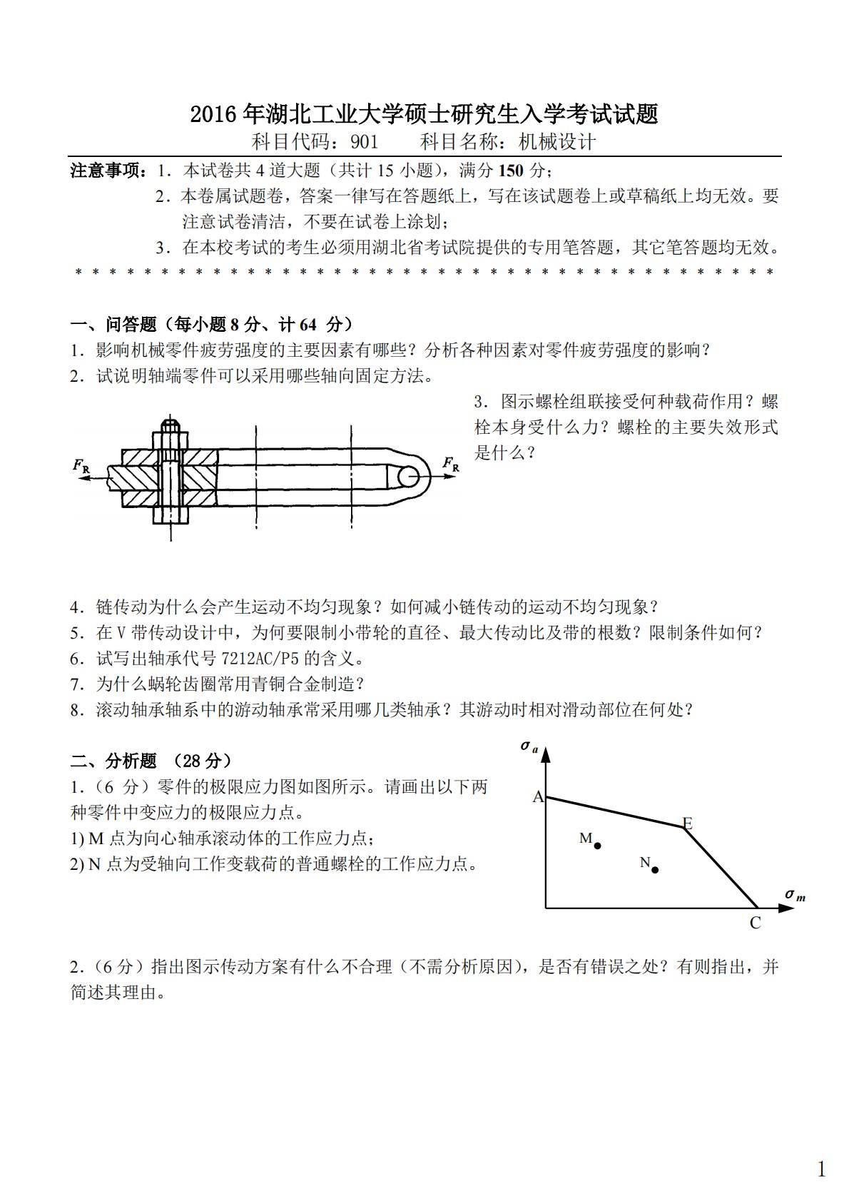 2016年湖北工业大学硕士研究生入学考试试题科目代码:901科目名称:机械设计注意事项:1.本试卷共4道大题(共计15小题),满分150分;2.本卷属试题卷,答案一律写在答题纸上,写在该试题卷上或草稿纸上均无效。要注意试卷清洁,不要在试卷上涂划;3.在本校考试的考生必须用湖北省考试院提供的专用笔答题,其它笔答题均无效。﹡﹡﹡﹡﹡﹡﹡﹡﹡﹡﹡﹡﹡﹡﹡﹡﹡﹡﹡﹡﹡﹡﹡﹡﹡﹡﹡﹡﹡﹡﹡﹡﹡﹡﹡﹡﹡﹡﹡﹡﹡一、问答题(每小题8分、计64分)1.影响机械零件疲劳强度的主要因素有哪些?分析各种因素对零件疲劳强度的影响?2.试说明轴端零件可以采用哪些轴向固定方法。3.图示螺栓组联接受何种载荷作用?螺栓本身受...