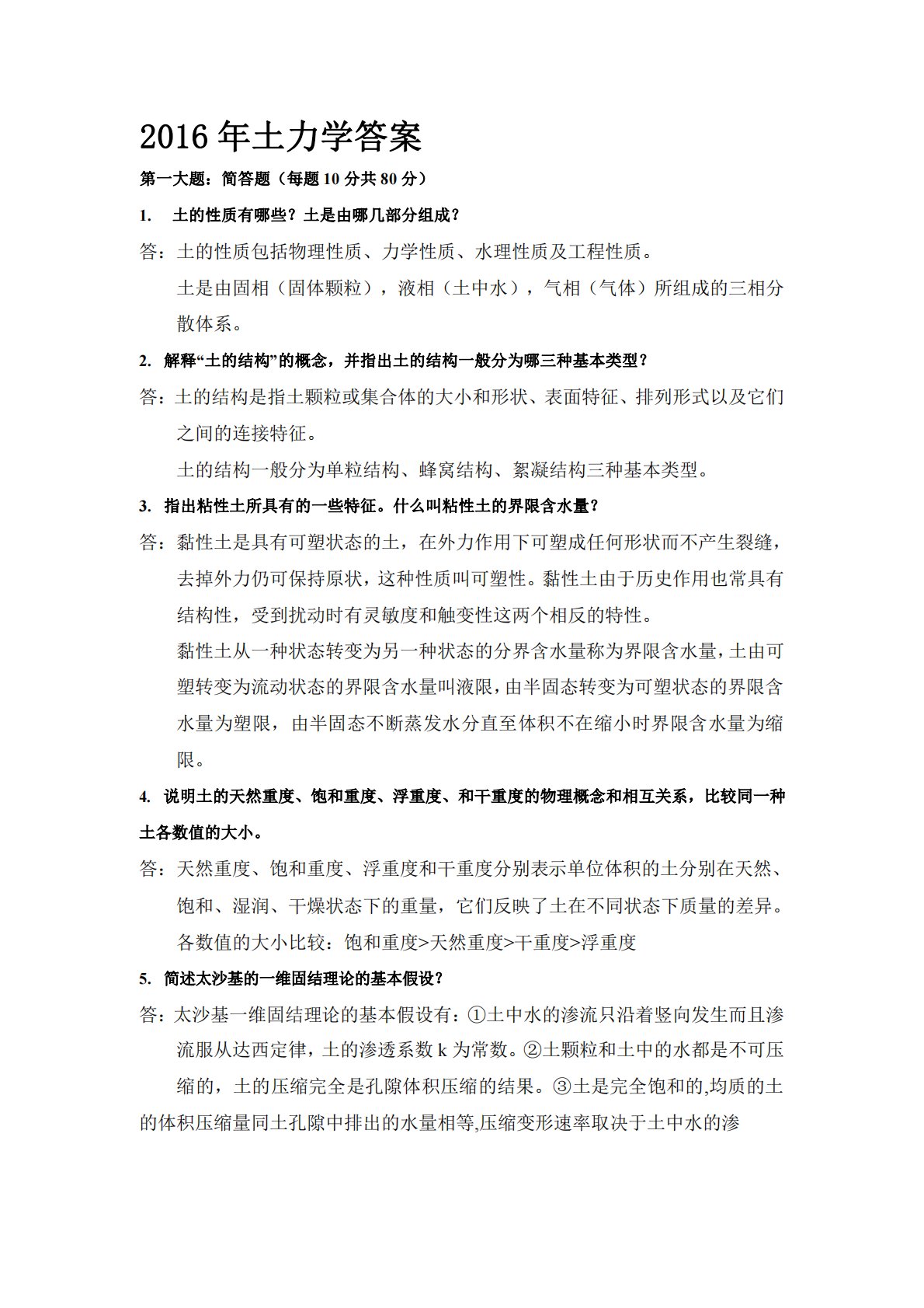 2016年土力学答案第一大题:简答题(每题10分共80分)1.土的性质有哪些?土是由哪几部分组成?答:土的性质包括物理性质、力学性质、水理性质及工程性质。土是由固相(固体颗粒),液相(土中水),气相(气体)所组成的三相分散体系。2.解释“土的结构”的概念,并指出土的结构一般分为哪三种基本类型?答:土的结构是指土颗粒或集合体的大小和形状、表面特征、排列形式以及它们之间的连接特征。土的结构一般分为单粒结构、蜂窝结构、絮凝结构三种基本类型。3.指出粘性土所具有的一些特征。什么叫粘性土的界限含水量?答:黏性土是具有可塑状态的土,在外力作用下可塑成任何形状而不产生裂缝,去掉外力仍可保持原状,这种性质叫可...