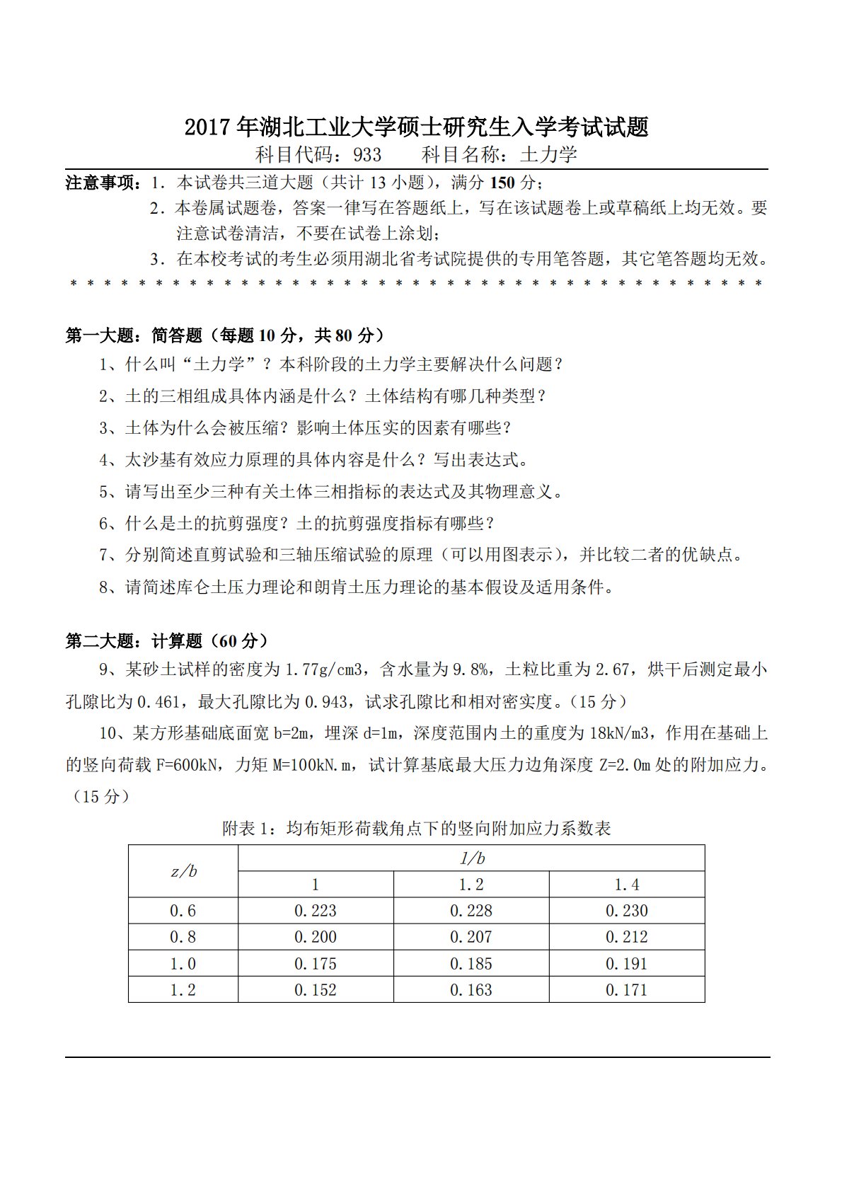 湖北工业大学2017年33土力学考研真题