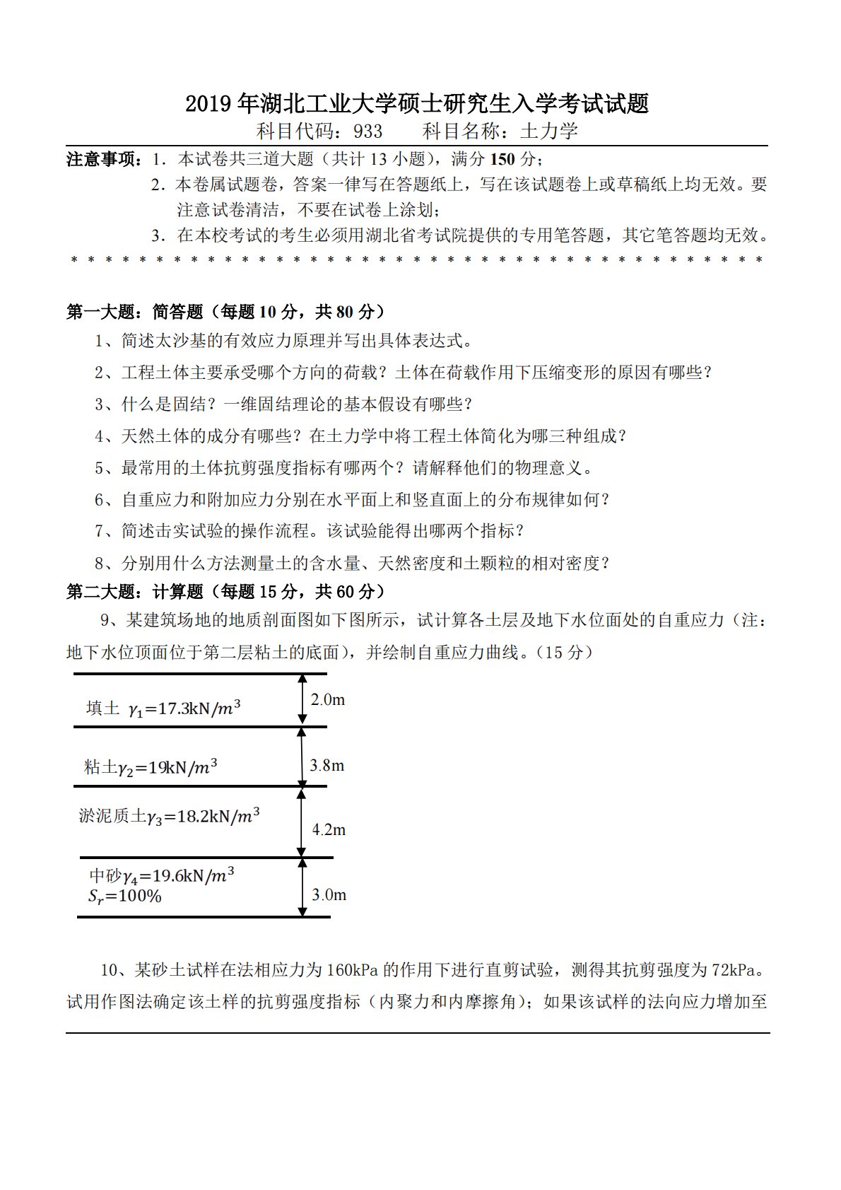 湖北工业大学2019年33土力学考研真题