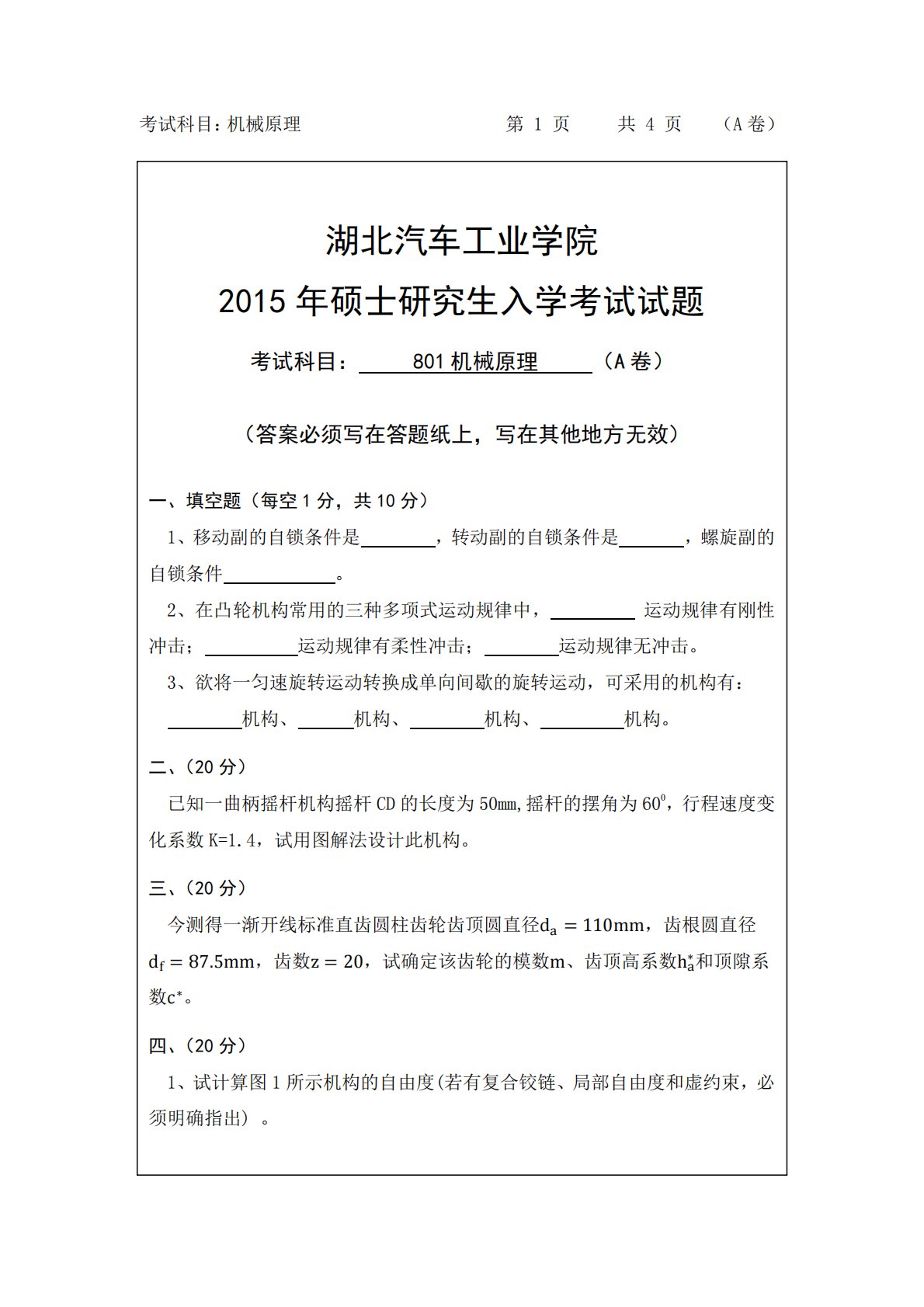湖北汽车工业学院801机械原理2015年真题A