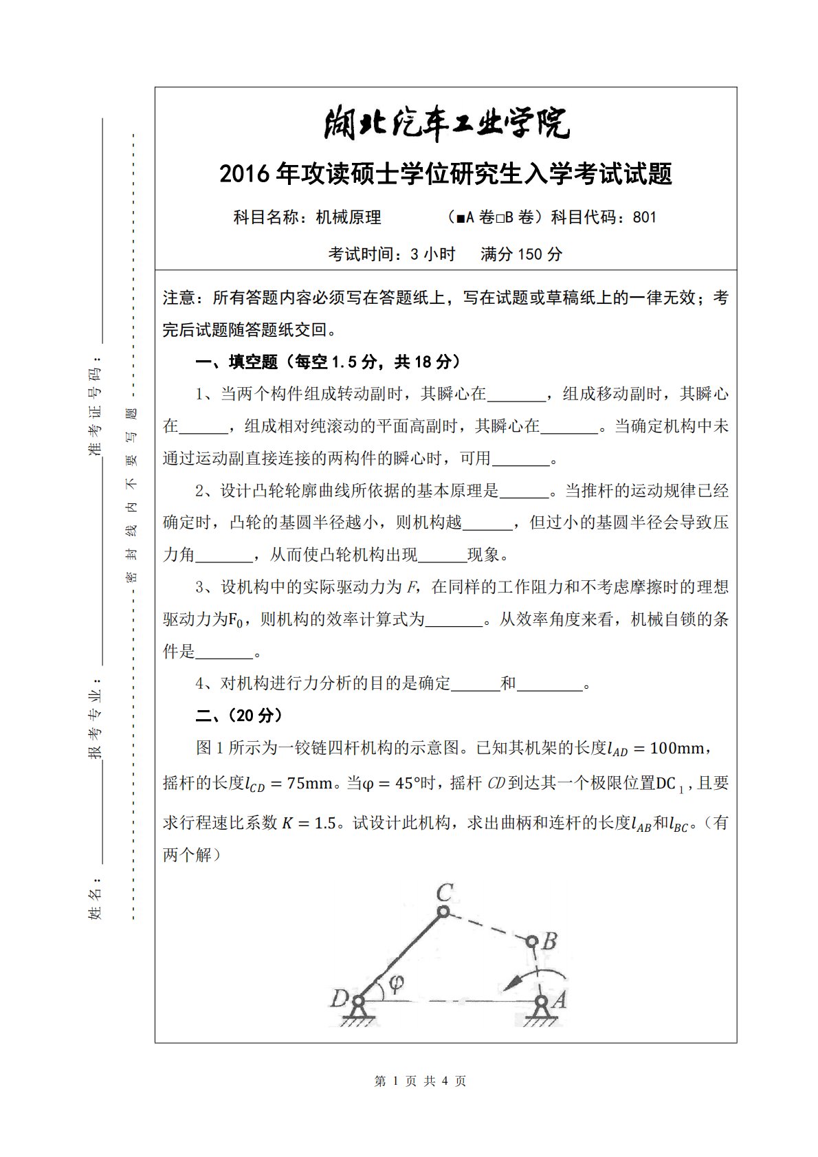 第1页共4页姓名:报考专业:准考证号码:-----------------------------------密封线内不要写题----------------------------2016年攻读硕士学位研究生入学考试试题科目名称:机械原理(■A卷□B卷)科目代码:801考试时间:3小时满分150分注意:所有答题内容必须写在答题纸上,写在试题或草稿纸上的一律无效;考完后试题随答题纸交回。一、填空题(每空1.5分,共18分)1、当两个构件组成转动副时,其瞬心在,组成移动副时,其瞬心在,组成相对纯滚动的平面高副时,其瞬心在。当确定机构中未通过运动副直接连接的两构件的瞬心时,可用。2、设计凸轮轮廓曲...