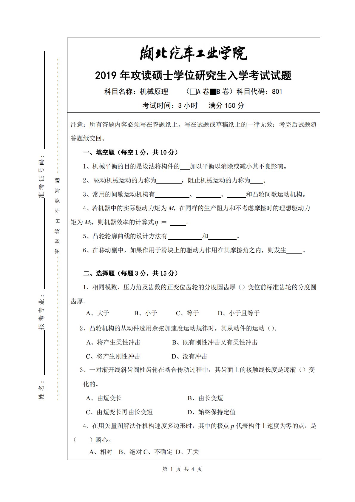 第1页共4页姓名:报考专业:准考证号码:-----------------------------------密封线内不要写题----------------------------2019年攻读硕士学位研究生入学考试试题科目名称:机械原理(□A卷■B卷)科目代码:801考试时间:3小时满分150分注意:所有答题内容必须写在答题纸上,写在试题或草稿纸上的一律无效;考完后试题随答题纸交回。一、填空题(每空1分,共10分)1、机械平衡的目的是设法将构件的加以平衡以消除或减小其不良影响。2、驱动机械运动的力称为,阻止机械运动的力称为。3、常用的间歇运动机构有、、和凸轮间歇运动机构。4、若机器中的实际...