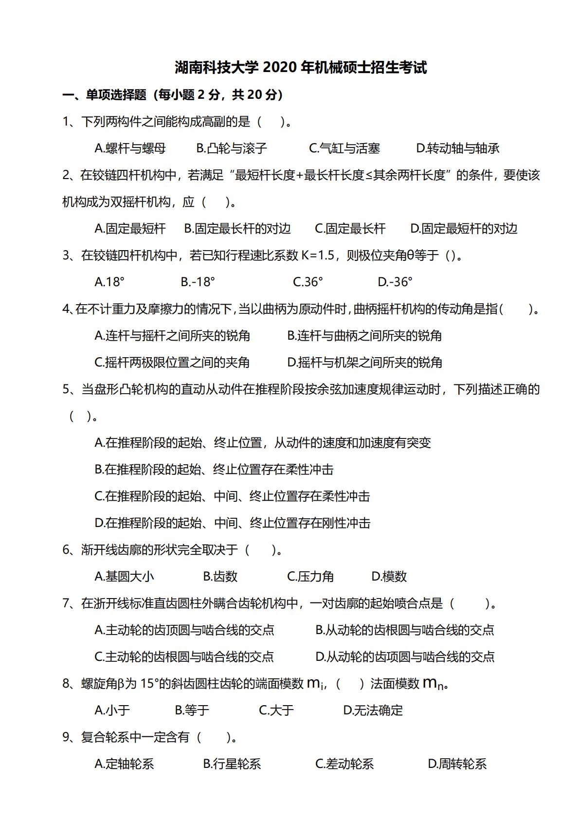 湖南科技大学2020年机械硕士招生考试一、单项选择题(每小题2分,共20分)1、下列两构件之间能构成高副的是()。A.螺杆与螺母B.凸轮与滚子C.气缸与活塞D.转动轴与轴承2、在铰链四杆机构中,若满足“最短杆长度+最长杆长度≤其余两杆长度”的条件,要使该机构成为双摇杆机构,应()。A.固定最短杆B.固定最长杆的对边C.固定最长杆D.固定最短杆的对边3、在铰链四杆机构中,若已知行程速比系数K=1.5,则极位夹角θ等于()。A.18°B.-18°C.36°D.-36°4、在不计重力及摩擦力的情况下,当以曲柄为原动件时,曲柄摇杆机构的传动角是指()。A.连杆与摇杆之间所夹的锐角C.摇杆两极限位置之间...