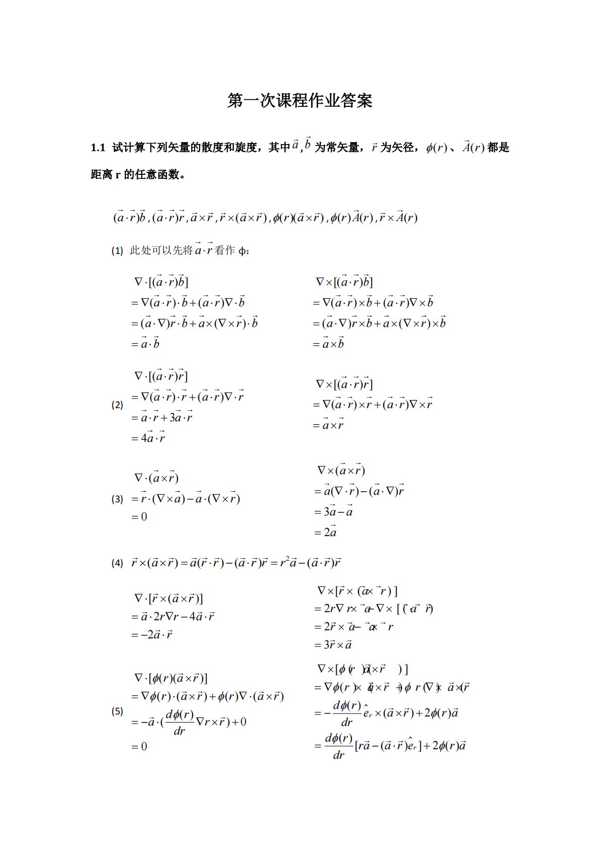第一次课程作业答案1.1试计算下列矢量的散度和旋度,其中,为常矢量,为矢径,、都是距离r的任意函数。,,,,,,(1)此处可以先将看作ϕ:(2)(3)(4)(5)abr()r()Ar()arb()arrar()rar()()rar()()rAr()rArar[()]()()()()arbarbarbarbarbab[()]()()()()arbarbarbarbarbab[()]()()34arrarrarrararar[()]()()arrarrar...