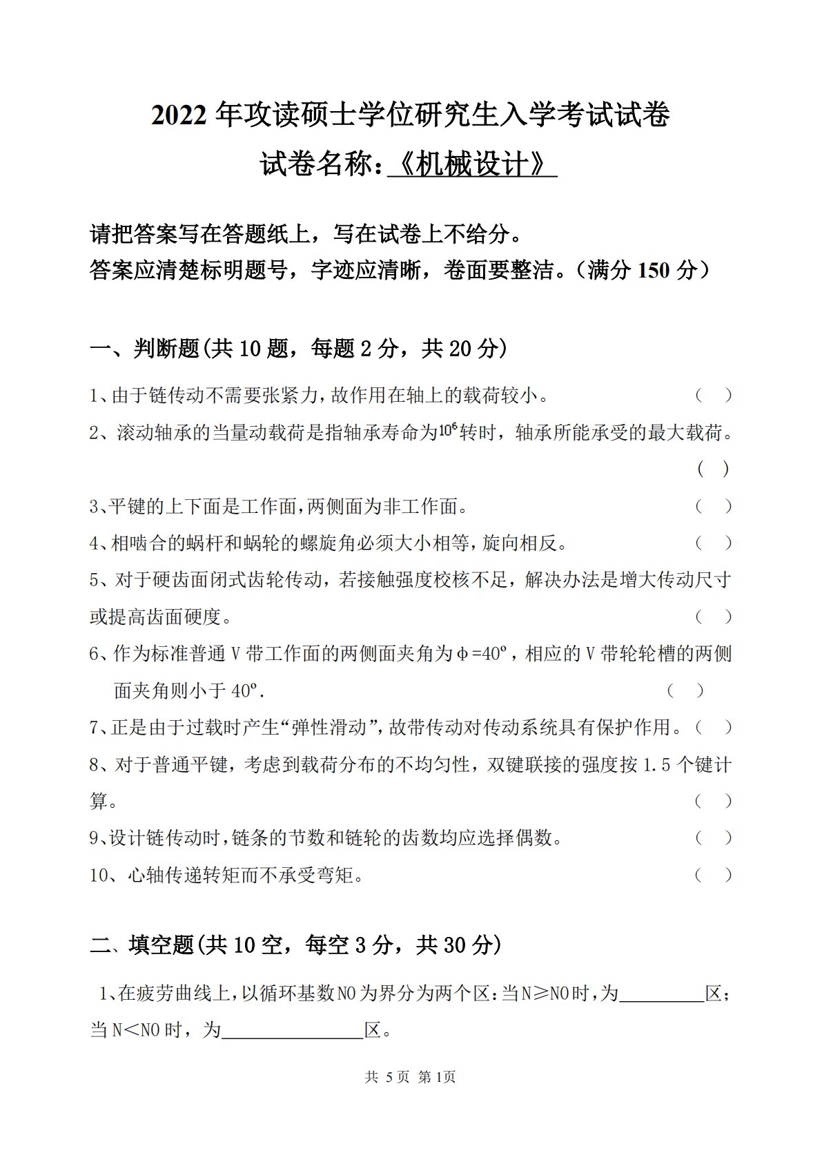 共5页第1页2022年攻读硕士学位研究生入学考试试卷试卷名称:《机械设计》请把答案写在答题纸上,写在试卷上不给分。答案应清楚标明题号,字迹应清晰,卷面要整洁。(满分150分)一、判断题(共10题,每题2分,共20分)1、由于链传动不需要张紧力,故作用在轴上的载荷较小。()2、滚动轴承的当量动载荷是指轴承寿命为转时,轴承所能承受的最大载荷。()3、平键的上下面是工作面,两侧面为非工作面。()4、相啮合的蜗杆和蜗轮的螺旋角必须大小相等,旋向相反。()5、对于硬齿面闭式齿轮传动,若接触强度校核不足,解决办法是增大传动尺寸或提高齿面硬度。()6、作为标准普通V带工作面的两侧面夹角为φ=40º,相应的V...
