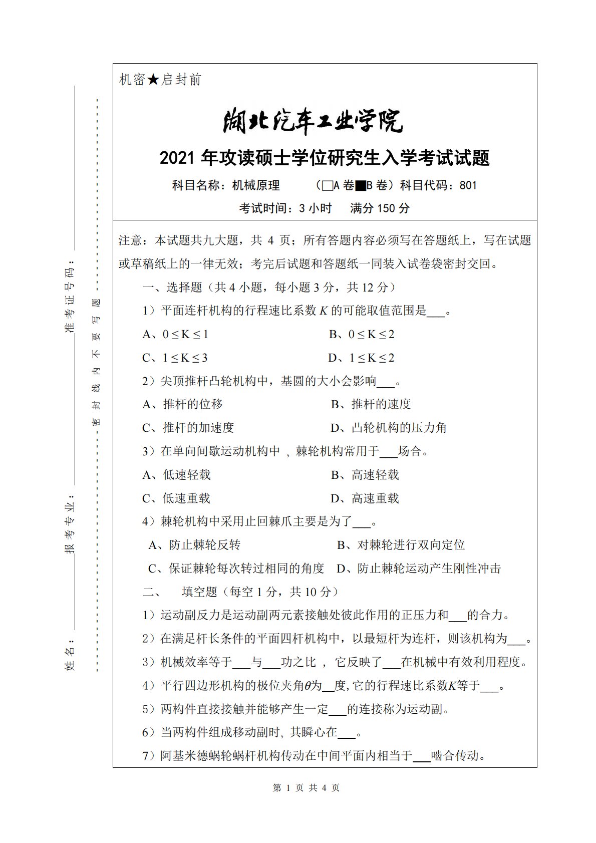 第1页共4页姓名:报考专业:准考证号码:-----------------------------------密封线内不要写题----------------------------机密★启封前2021年攻读硕士学位研究生入学考试试题科目名称:机械原理(□A卷■B卷)科目代码:801考试时间:3小时满分150分注意:本试题共九大题,共4页;所有答题内容必须写在答题纸上,写在试题或草稿纸上的一律无效;考完后试题和答题纸一同装入试卷袋密封交回。一、选择题(共4小题,每小题3分,共12分)1)平面连杆机构的行程速比系数K的可能取值范围是___。A、0≤K≤1B、0≤K≤2C、1≤K≤3D、1≤K≤2...