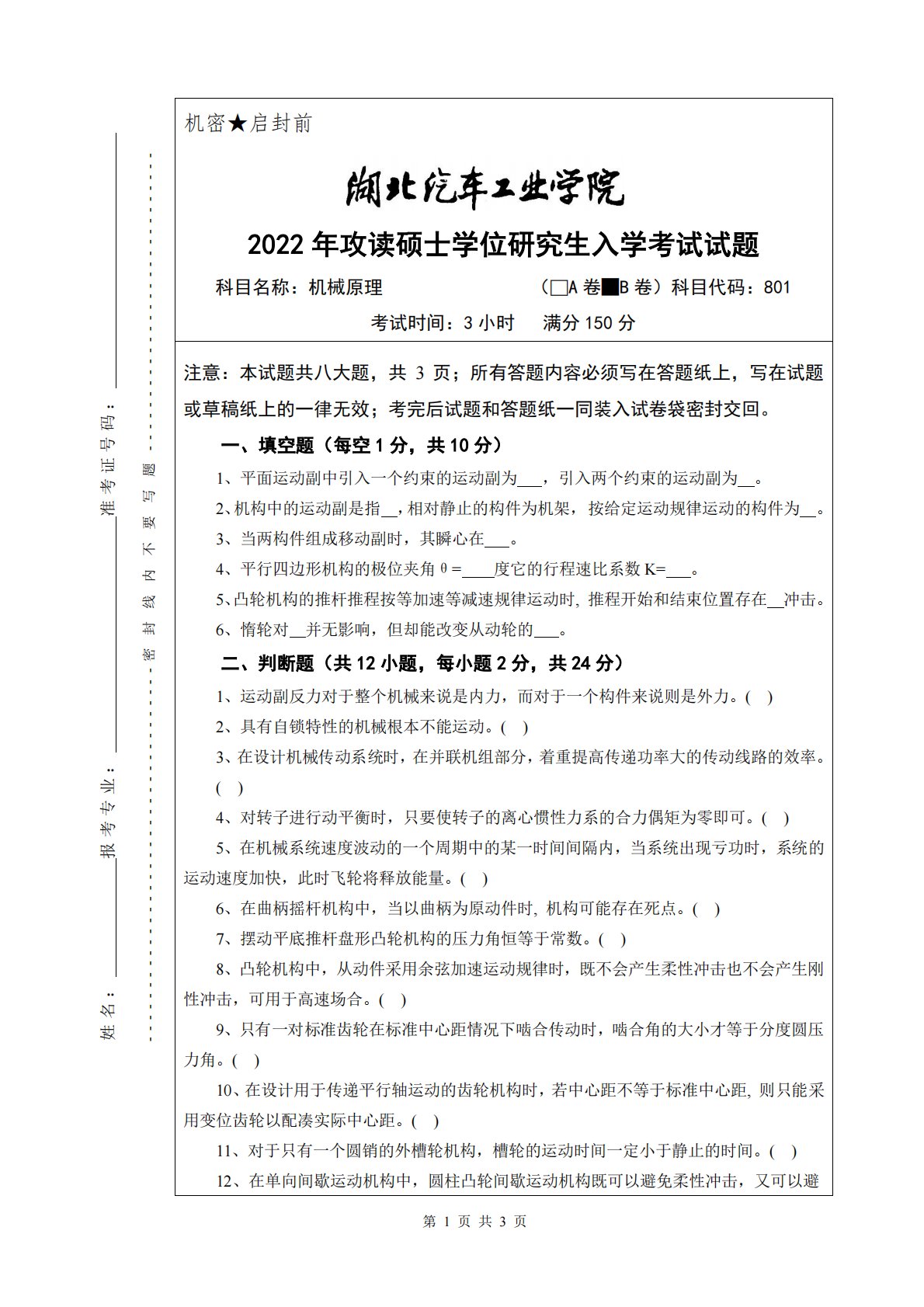 第1页共3页姓名:报考专业:准考证号码:-----------------------------------密封线内不要写题----------------------------机密★启封前2022年攻读硕士学位研究生入学考试试题科目名称:机械原理(□A卷█B卷)科目代码:801考试时间:3小时满分150分注意:本试题共八大题,共3页;所有答题内容必须写在答题纸上,写在试题或草稿纸上的一律无效;考完后试题和答题纸一同装入试卷袋密封交回。一、填空题(每空1分,共10分)1、平面运动副中引入一个约束的运动副为,引入两个约束的运动副为。2、机构中的运动副是指,相对静止的构件为机架,按给定运动规律...
