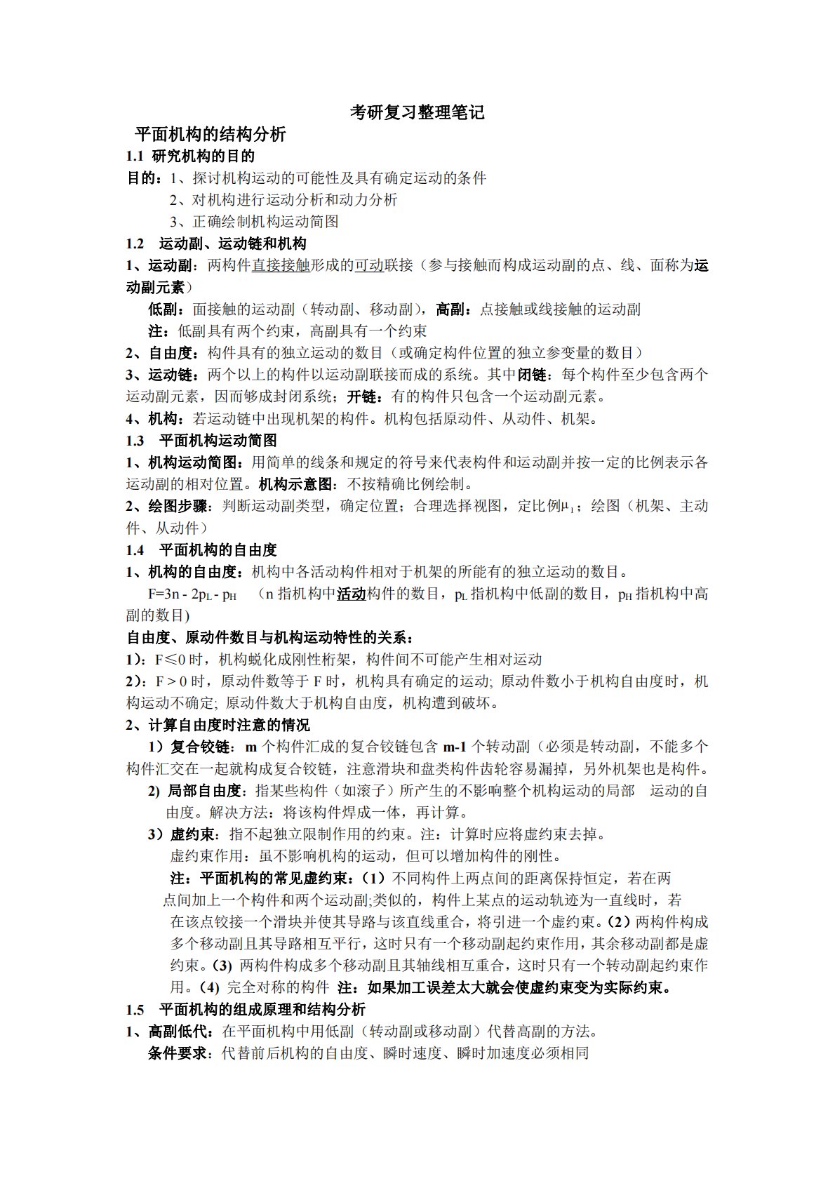 考研复习整理笔记平面机构的结构分析1.1研究机构的目的目的:1、探讨机构运动的可能性及具有确定运动的条件2、对机构进行运动分析和动力分析3、正确绘制机构运动简图1.2运动副、运动链和机构1、运动副:两构件直接接触形成的可动联接(参与接触而构成运动副的点、线、面称为运动副元素)低副:面接触的运动副(转动副、移动副),高副:点接触或线接触的运动副注:低副具有两个约束,高副具有一个约束2、自由度:构件具有的独立运动的数目(或确定构件位置的独立参变量的数目)3、运动链:两个以上的构件以运动副联接而成的系统。其中闭链:每个构件至少包含两个运动副元素,因而够成封闭系统;开链:有的构件只包含一个运动副元素。...