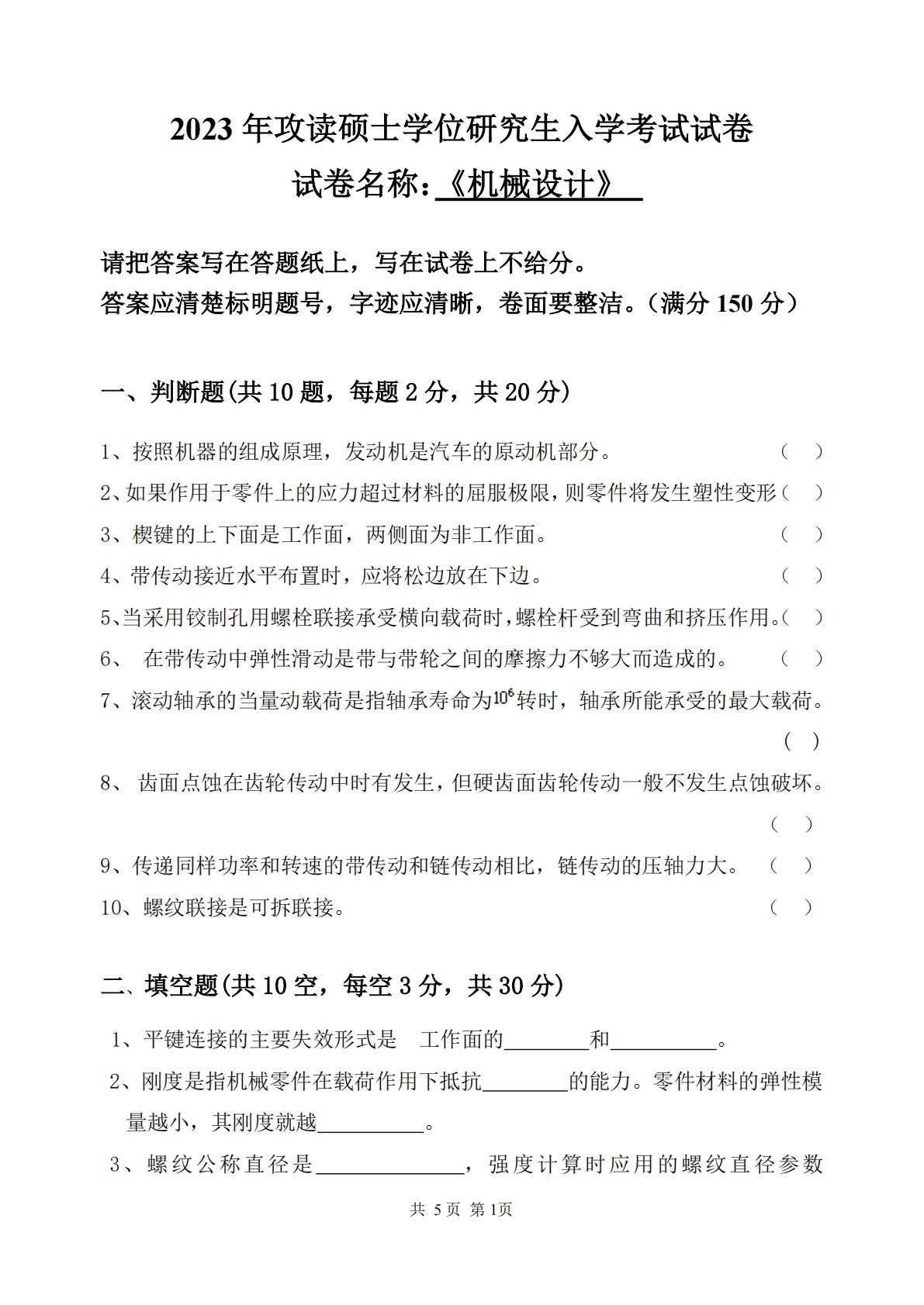 共5页第1页2023年攻读硕士学位研究生入学考试试卷试卷名称:《机械设计》请把答案写在答题纸上,写在试卷上不给分。答案应清楚标明题号,字迹应清晰,卷面要整洁。(满分150分)一、判断题(共10题,每题2分,共20分)1、按照机器的组成原理,发动机是汽车的原动机部分。()2、如果作用于零件上的应力超过材料的屈服极限,则零件将发生塑性变形()3、楔键的上下面是工作面,两侧面为非工作面。()4、带传动接近水平布置时,应将松边放在下边。()5、当采用铰制孔用螺栓联接承受横向载荷时,螺栓杆受到弯曲和挤压作用。()6、在带传动中弹性滑动是带与带轮之间的摩擦力不够大而造成的。()7、滚动轴承的当量动载荷是指...