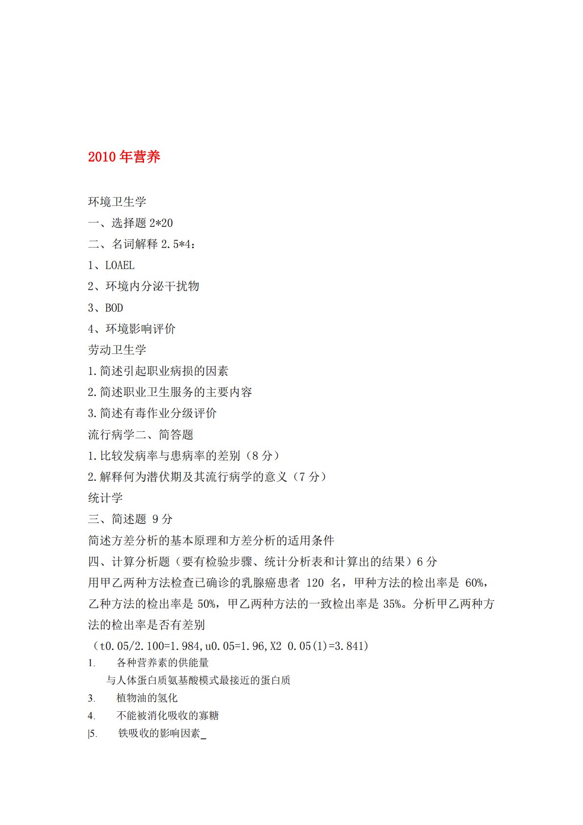 2010年营养环境卫生学一、选择题2*20二、名词解释2.5*4:1、LOAEL2、环境内分泌干扰物3、BOD4、环境影响评价劳动卫生学1.简述引起职业病损的因素2.简述职业卫生服务的主要内容3.简述有毒作业分级评价流行病学二、简答题1.比较发病率与患病率的差别(8分)2.解释何为潜伏期及其流行病学的意义(7分)统计学三、简述题9分简述方差分析的基本原理和方差分析的适用条件四、计算分析题(要有检验步骤、统计分析表和计算出的结果)6分用甲乙两种方法检查已确诊的乳腺癌患者120名,甲种方法的检出率是60%,乙种方法的检出率是50%,甲乙两种方法的一致检出率是35%。分析甲乙两种方法的检出率是否有差...