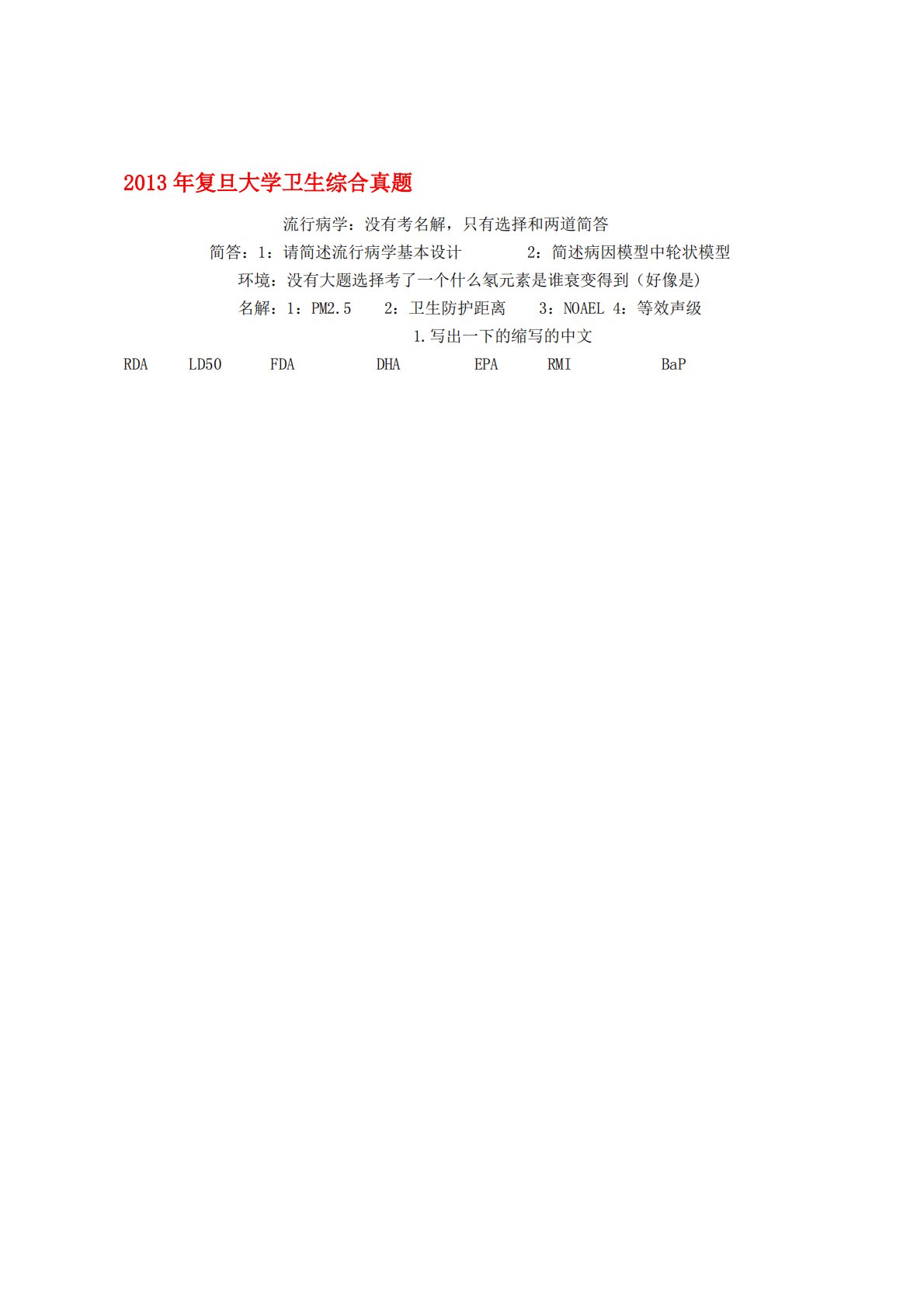 2013年复旦大学卫生综合真题流行病学:没有考名解,只有选择和两道简答简答:1:请简述流行病学基本设计2:简述病因模型中轮状模型环境:没有大题选择考了一个什么氡元素是谁衰变得到(好像是)名解:1:PM2.52:卫生防护距离3:NOAEL4:等效声级1.写出一下的缩写的中文RDAFDADHAEPARMIBaPLD502013年复旦大学卫生综合真题流行病学:没有考名解,只有选择和两道简答简答:1:请简述流行病学基本设计2:简述病因模型中轮状模型环境:没有大题选择考了一个什么氡元素是谁衰变得到(好像是)名解:1:PM2.52:卫生防护距离3:NOAEL4:等效声级1.写出一下的缩写的中文RDAFDA...