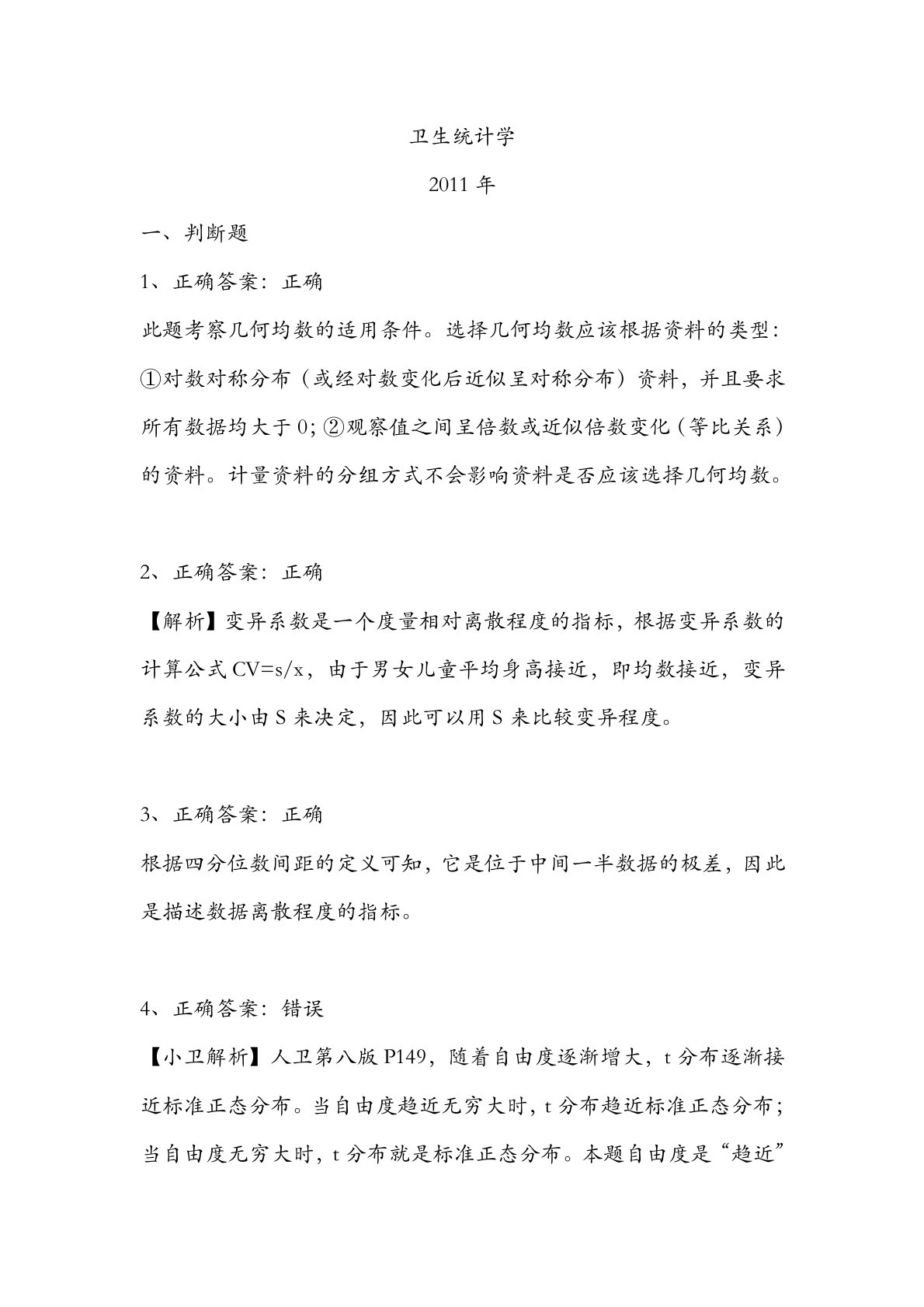 卫生统计学2011年判断题1、正确答案:正确此题考察几何均数的适用条件。选择几何均数应该根据资料的类型:①对数对称分布(或经对数变化后近似呈对称分布)资料,并且要求所有数据均大于0;②观察值之间呈倍数或近似倍数变化(等比关系)的资料。计量资料的分组方式不会影响资料是否应该选择几何均数。2、正确答案:正确【解析】变异系数是一个度量相对离散程度的指标,根据变异系数的计算公式CV=s/x,由于男女儿童平均身高接近,即均数接近,变异系数的大小由S来决定,因此可以用S来比较变异程度。3、正确答案:正确根据四分位数间距的定义可知,它是位于中间一半数据的极差,因此是描述数据离散程度的指标。4、正确答案:错误...