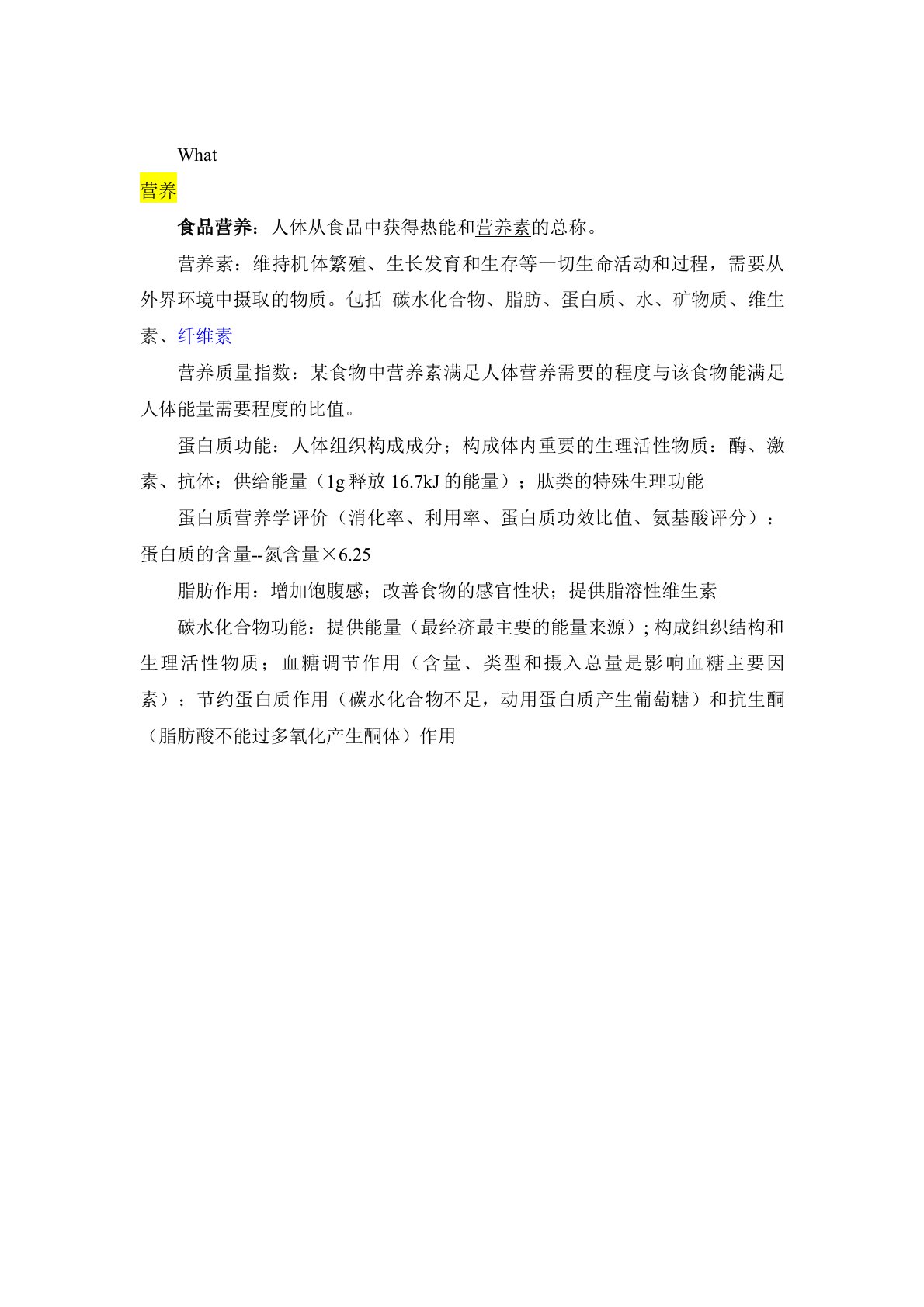 What营养食品营养:人体从食品中获得热能和营养素的总称。营养素:维持机体繁殖、生长发育和生存等一切生命活动和过程,需要从外界环境中摄取的物质。包括碳水化合物、脂肪、蛋白质、水、矿物质、维生素、纤维素营养质量指数:某食物中营养素满足人体营养需要的程度与该食物能满足人体能量需要程度的比值。蛋白质功能:人体组织构成成分;构成体内重要的生理活性物质:酶、激素、抗体;供给能量(1g释放16.7kJ的能量);肽类的特殊生理功能蛋白质营养学评价(消化率、利用率、蛋白质功效比值、氨基酸评分):蛋白质的含量--氮含量×6.25脂肪作用:增加饱腹感;改善食物的感官性状;提供脂溶性维生素碳水化合物功能:提供能量(...