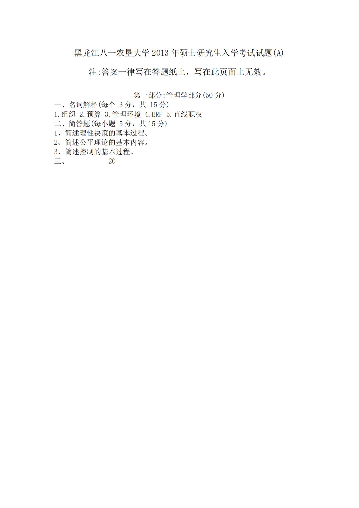 黑龙江八一农垦大学2013年硕士研究生入学考试试题(A)注:答案一律写在答题纸上,写在此页面上无效。第一部分:管理学部分(50分)一、名词解释(每个3分,共15分)1.组织2.预算3.管理环境4.ERP5.直线职权二、简答题(每小题5分,共15分)1、简述理性决策的基本过程。2、简述公平理论的基本内容。3、简述控制的基本过程。三、20黑龙江八一农垦大学2013年硕士研究生入学考试试题(A)注:答案一律写在答题纸上,写在此页面上无效。第一部分:管理学部分(50分)一、名词解释(每个3分,共15分)1.组织2.预算3.管理环境4.ERP5.直线职权二、简答题(每小题5分,共15分)1、简述理性决策...