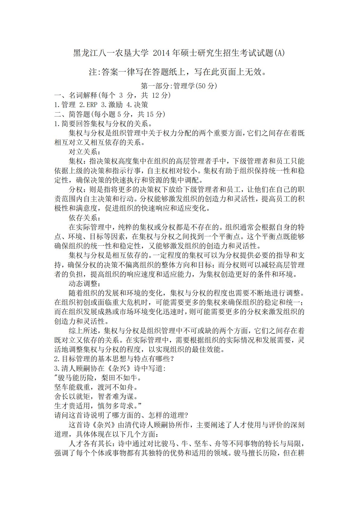 黑龙江八一农垦大学2014年硕士研究生招生考试试题(A)注:答案一律写在答题纸上,写在此页面上无效。第一部分:管理学(50分)一、名词解释(每个3分,共12分)1.管理2.ERP3.激励4.决策二、简答题(每小题5分,共15分)1.简要回答集权与分权的关系。集权与分权是组织管理中关于权力分配的两个重要方面,它们之间存在着既相互对立又相互依存的关系。对立关系:集权:指决策权高度集中在组织的高层管理者手中,下级管理者和员工只能依据上级的决策和指示行事,自主权相对较小。集权有助于组织保持统一性和稳定性,确保决策的快速执行和资源的集中调配。分权:则是指将更多的决策权下放给下级管理者和员工,让他们在自己...
