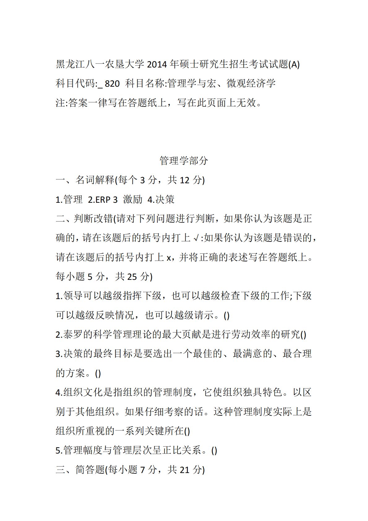 黑龙江八一农垦大学2014年硕士研究生招生考试试题(A)科目代码:_820科目名称:管理学与宏、微观经济学注:答案一律写在答题纸上,写在此页面上无效。管理学部分一、名词解释(每个3分,共12分)1.管理2.ERP3激励4.决策二、判断改错(请对下列问题进行判断,如果你认为该题是正确的,请在该题后的括号内打上√:如果你认为该题是错误的,请在该题后的括号内打上x,并将正确的表述写在答题纸上。每小题5分,共25分)1.领导可以越级指挥下级,也可以越级检查下级的工作;下级可以越级反映情况,也可以越级请示。()2.泰罗的科学管理理论的最大页献是进行劳动效率的研究()3.决策的最终目标是要选出一个最佳的、...