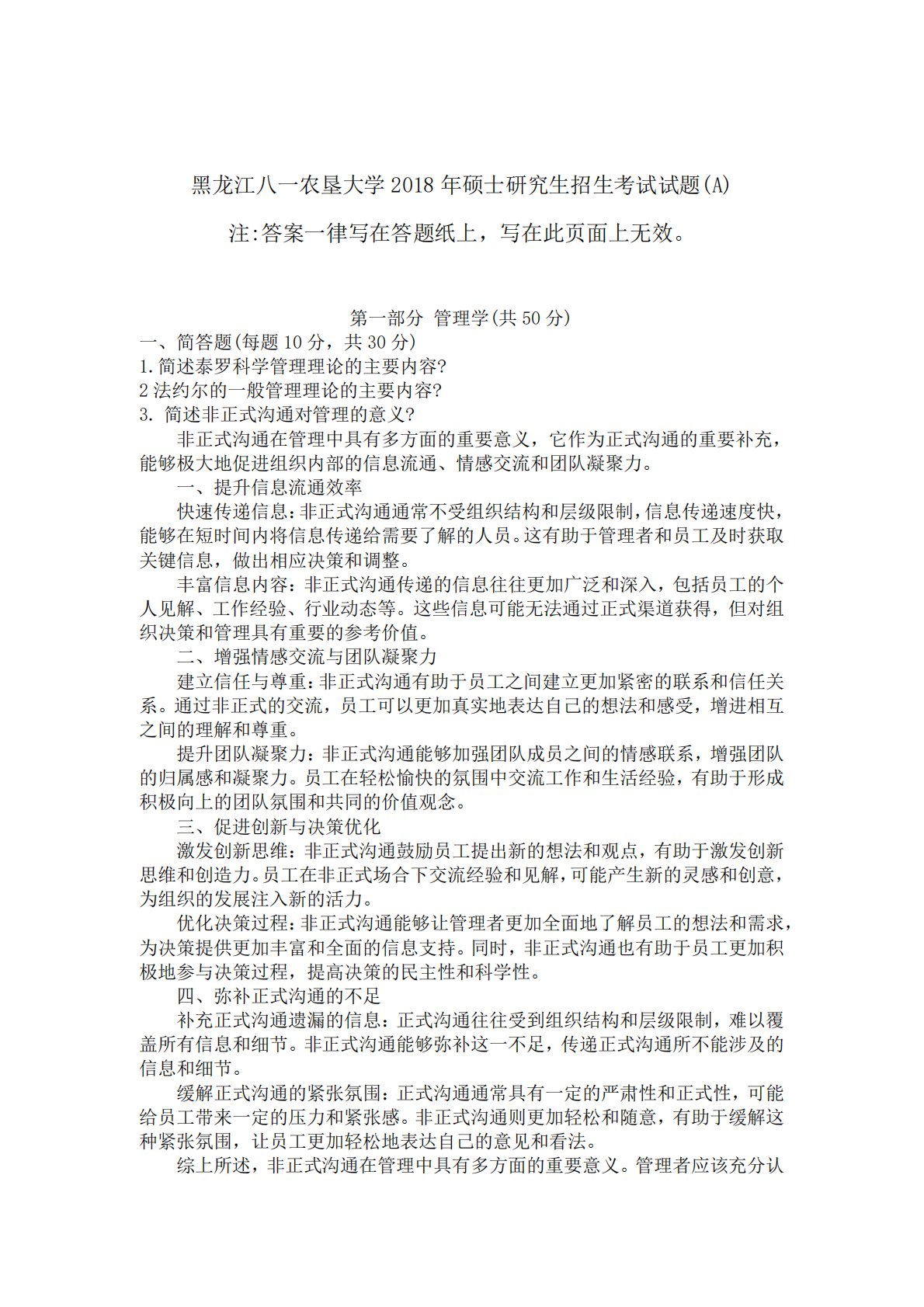 黑龙江八一农垦大学2018年硕士研究生招生考试试题(A)注:答案一律写在答题纸上,写在此页面上无效。第一部分管理学(共50分)一、简答题(每题10分,共30分)1.简述泰罗科学管理理论的主要内容?2法约尔的一般管理理论的主要内容?3.简述非正式沟通对管理的意义?非正式沟通在管理中具有多方面的重要意义,它作为正式沟通的重要补充,能够极大地促进组织内部的信息流通、情感交流和团队凝聚力。一、提升信息流通效率快速传递信息:非正式沟通通常不受组织结构和层级限制,信息传递速度快,能够在短时间内将信息传递给需要了解的人员。这有助于管理者和员工及时获取关键信息,做出相应决策和调整。丰富信息内容:非正式沟通传递...