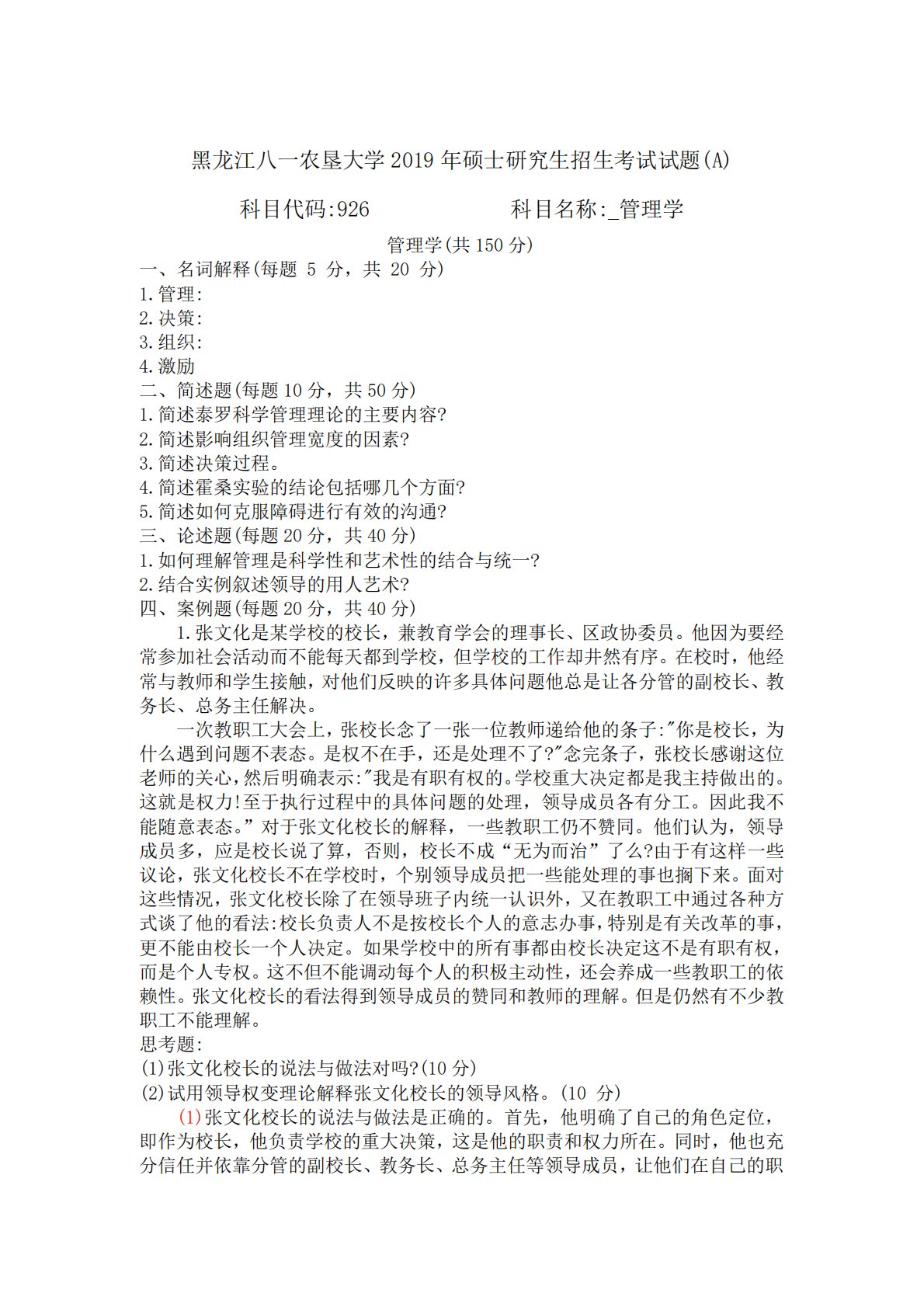 黑龙江八一农垦大学2019年硕士研究生招生考试试题(A)科目代码:926科目名称:_管理学管理学(共150分)一、名词解释(每题5分,共20分)1.管理:2.决策:3.组织:4.激励二、简述题(每题10分,共50分)1.简述泰罗科学管理理论的主要内容?2.简述影响组织管理宽度的因素?3.简述决策过程。4.简述霍桑实验的结论包括哪几个方面?5.简述如何克服障碍进行有效的沟通?三、论述题(每题20分,共40分)1.如何理解管理是科学性和艺术性的结合与统一?2.结合实例叙述领导的用人艺术?四、案例题(每题20分,共40分)1.张文化是某学校的校长,兼教育学会的理事长、区政协委员。他因为要经常参加社会...