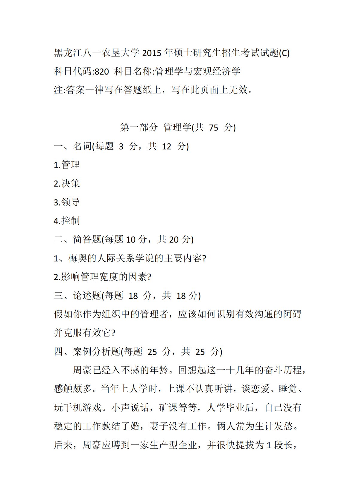 黑龙江八一农垦大学2015年硕士研究生招生考试试题(C)科日代码:820科目名称:管理学与宏观经济学注:答案一律写在答题纸上,写在此页面上无效。第一部分管理学(共75分)一、名词(每题3分,共12分)1.管理2.决策3.领导4.控制二、简答题(每题10分,共20分)1、梅奥的人际关系学说的主要内容?2.影响管理宽度的因素?三、论述题(每题18分,共18分)假如你作为组织中的管理者,应该如何识别有效沟通的阿碍并克服有效它?四、案例分析题(每题25分,共25分)周豪已经入不感的年龄。回想起这一十几年的奋斗历程,感触颇多。当年上人学时,上课不认真听讲,谈恋爱、睡觉、玩手机游戏。小声说话,矿课等等,人...