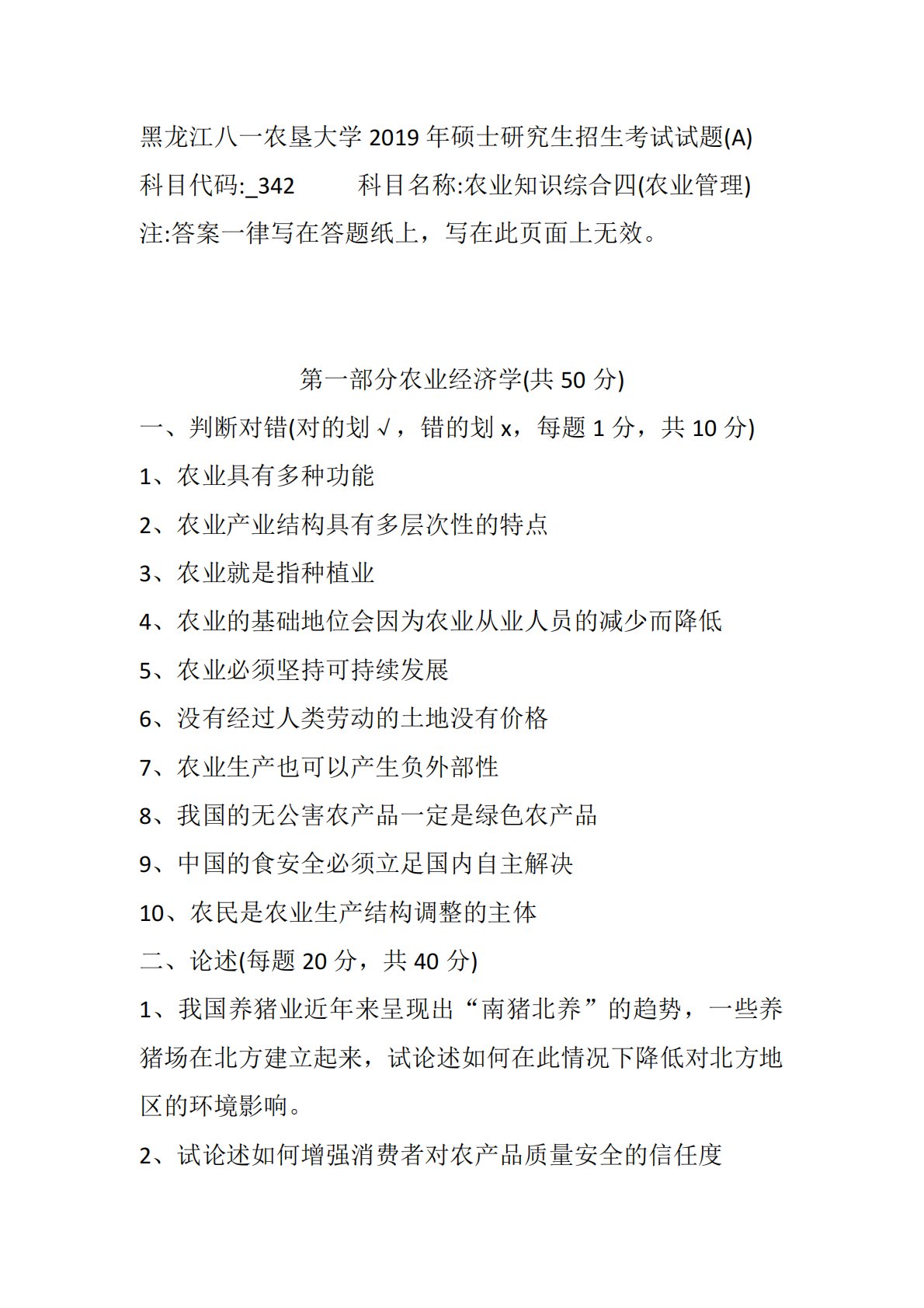 黑龙江八一农垦大学2019年硕士研究生招生考试试题(A)科目代码:_342科目名称:农业知识综合四(农业管理)注:答案一律写在答题纸上,写在此页面上无效。第一部分农业经济学(共50分)一、判断对错(对的划√,错的划x,每题1分,共10分)1、农业具有多种功能2、农业产业结构具有多层次性的特点3、农业就是指种植业4、农业的基础地位会因为农业从业人员的减少而降低5、农业必须坚持可持续发展6、没有经过人类劳动的土地没有价格7、农业生产也可以产生负外部性8、我国的无公害农产品一定是绿色农产品9、中国的食安全必须立足国内自主解决10、农民是农业生产结构调整的主体二、论述(每题20分,共40分)1、我国养...