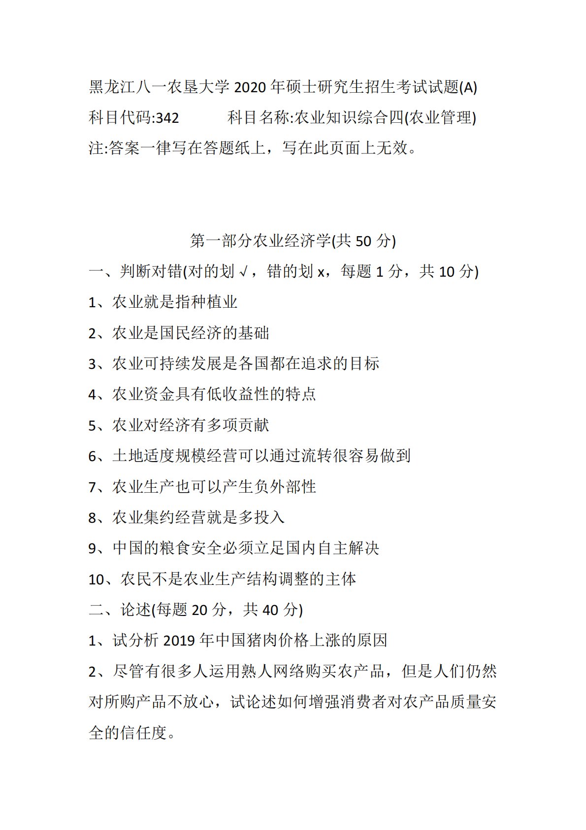 黑龙江八一农垦大学2020年硕士研究生招生考试试题(A)科目代码:342科目名称:农业知识综合四(农业管理)注:答案一律写在答题纸上,写在此页面上无效。第一部分农业经济学(共50分)一、判断对错(对的划√,错的划x,每题1分,共10分)1、农业就是指种植业2、农业是国民经济的基础3、农业可持续发展是各国都在追求的目标4、农业资金具有低收益性的特点5、农业对经济有多项贡献6、土地适度规模经营可以通过流转很容易做到7、农业生产也可以产生负外部性8、农业集约经营就是多投入9、中国的粮食安全必须立足国内自主解决10、农民不是农业生产结构调整的主体二、论述(每题20分,共40分)1、试分析2019年中国...
