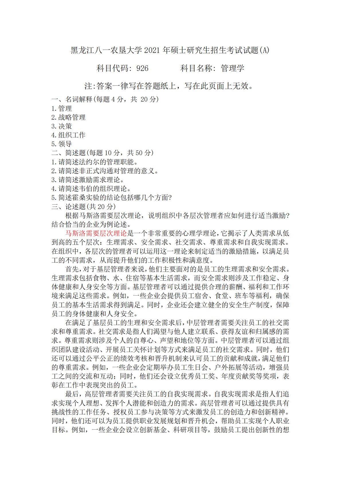黑龙江八一农垦大学2021年硕士研究生招生考试试题(A)科目代码:926科目名称:管理学注:答案一律写在答题纸上,写在此页面上无效。一、名词解释(每题4分,共20分)1.管理2.战略管理3.决策4.组织工作5.领导二、简述题(每题10分,共50分)1.请简述法约尔的管理职能。2.请简述非正式沟通对管理的意义。3.请简述激励需求理论。4.请简述韦伯的组织理论。5.简述霍桑实验的结论包括哪几个方面?三、论述题(共20分)根据马斯洛需要层次理论,说明组织中各层次管理者应如何进行适当激励?结合恰当的企业为例论述。马斯洛需要层次理论是一个非常重要的心理学理论,它揭示了人类需求从低到高的五个层次:生理需求...