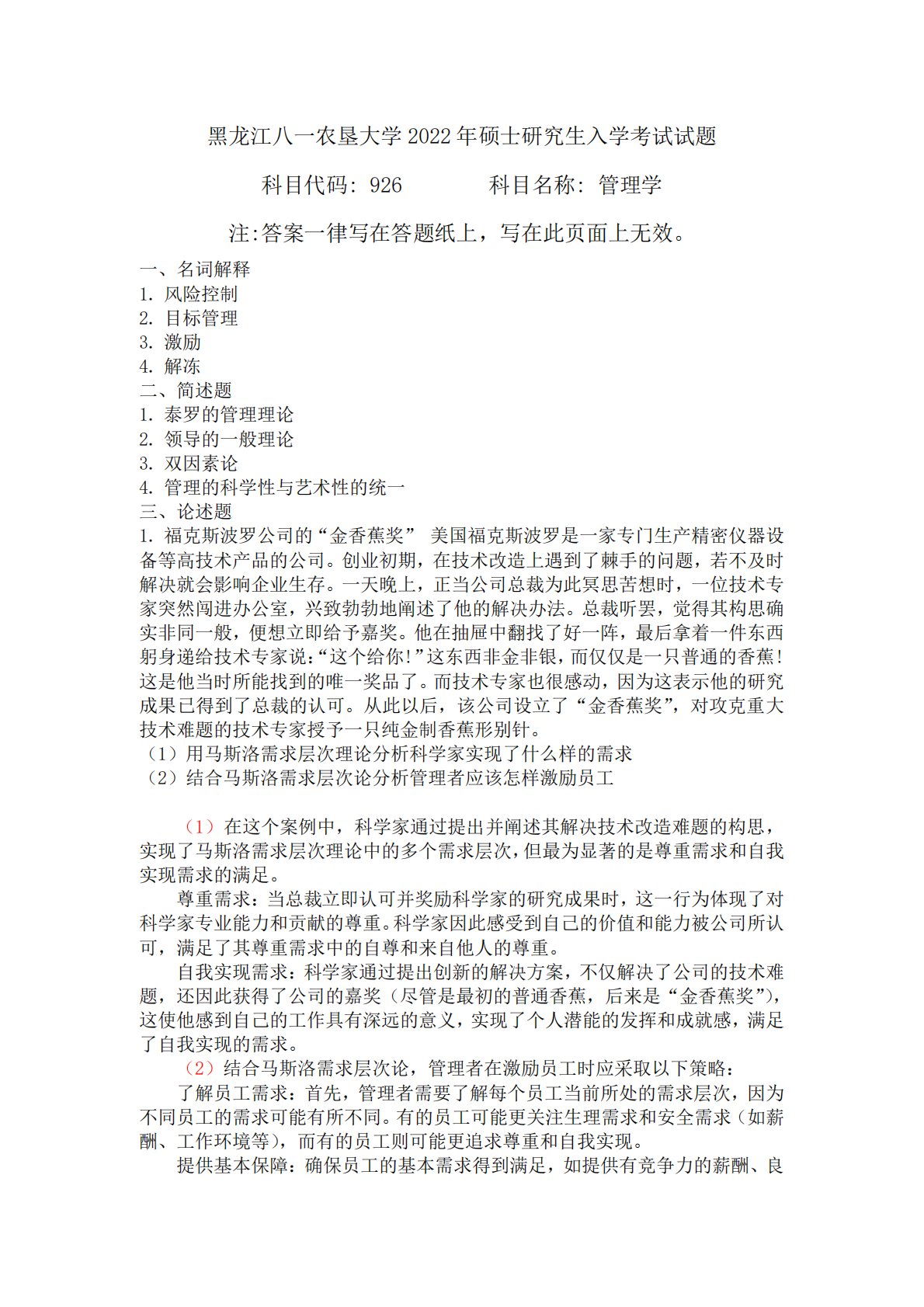 黑龙江八一农垦大学2022年硕士研究生入学考试试题科目代码:926科目名称:管理学注:答案一律写在答题纸上,写在此页面上无效。一、名词解释1.风险控制2.目标管理3.激励4.解冻二、简述题1.泰罗的管理理论2.领导的一般理论3.双因素论4.管理的科学性与艺术性的统一三、论述题1.福克斯波罗公司的“金香蕉奖”美国福克斯波罗是一家专门生产精密仪器设备等高技术产品的公司。创业初期,在技术改造上遇到了棘手的问题,若不及时解决就会影响企业生存。一天晚上,正当公司总裁为此冥思苦想时,一位技术专家突然闯进办公室,兴致勃勃地阐述了他的解决办法。总裁听罢,觉得其构思确实非同一般,便想立即给予嘉奖。他在抽屉中翻找...