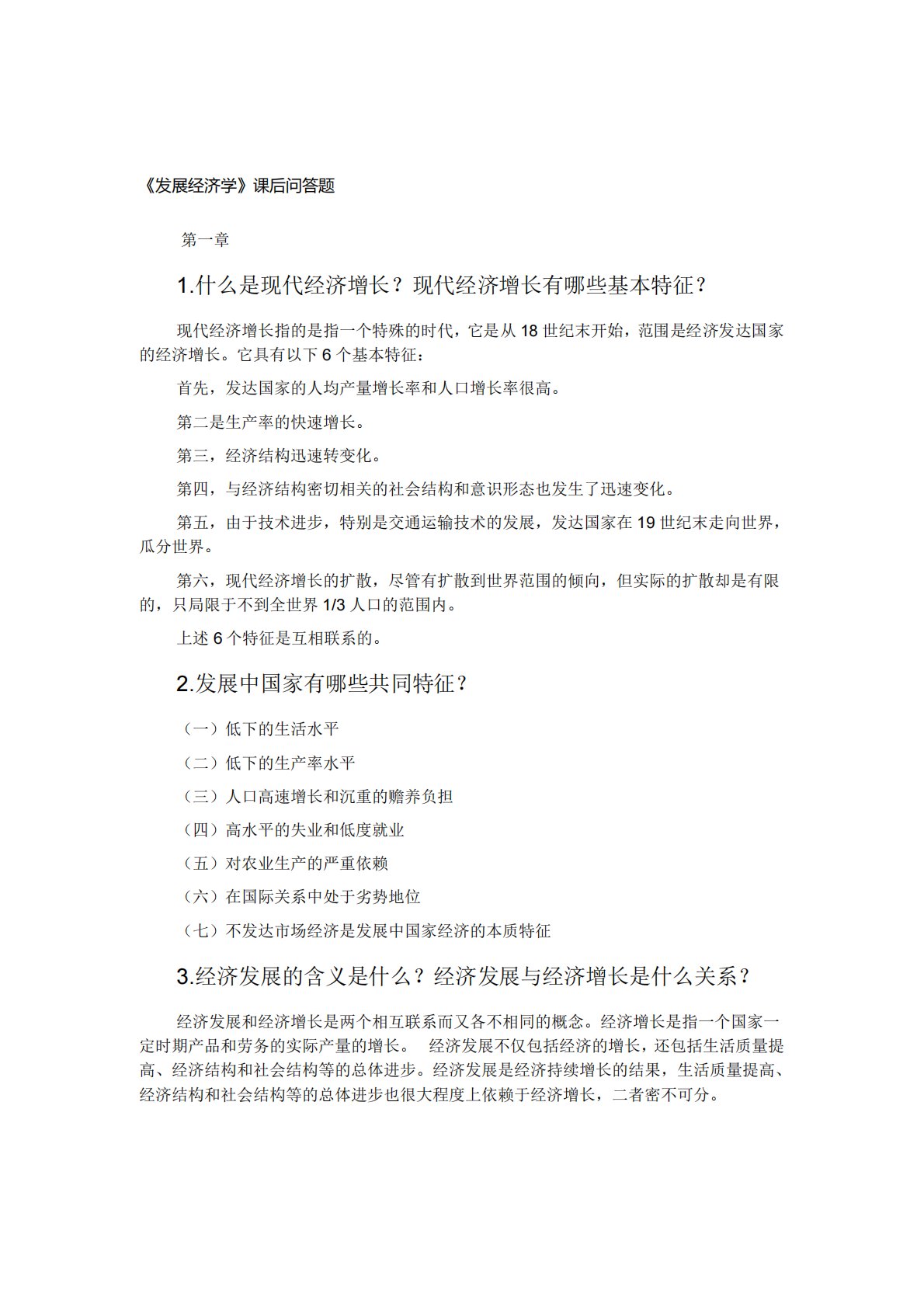 《发展经济学》课后问答题第一章1.什么是现代经济增长?现代经济增长有哪些基本特征?现代经济增长指的是指一个特殊的时代,它是从18世纪末开始,范围是经济发达国家的经济增长。它具有以下6个基本特征:首先,发达国家的人均产量增长率和人口增长率很高。第二是生产率的快速增长。第三,经济结构迅速转变化。第四,与经济结构密切相关的社会结构和意识形态也发生了迅速变化。第五,由于技术进步,特别是交通运输技术的发展,发达国家在19世纪末走向世界,瓜分世界。第六,现代经济增长的扩散,尽管有扩散到世界范围的倾向,但实际的扩散却是有限的,只局限于不到全世界1/3人口的范围内。上述6个特征是互相联系的。2.发展中国家有哪...